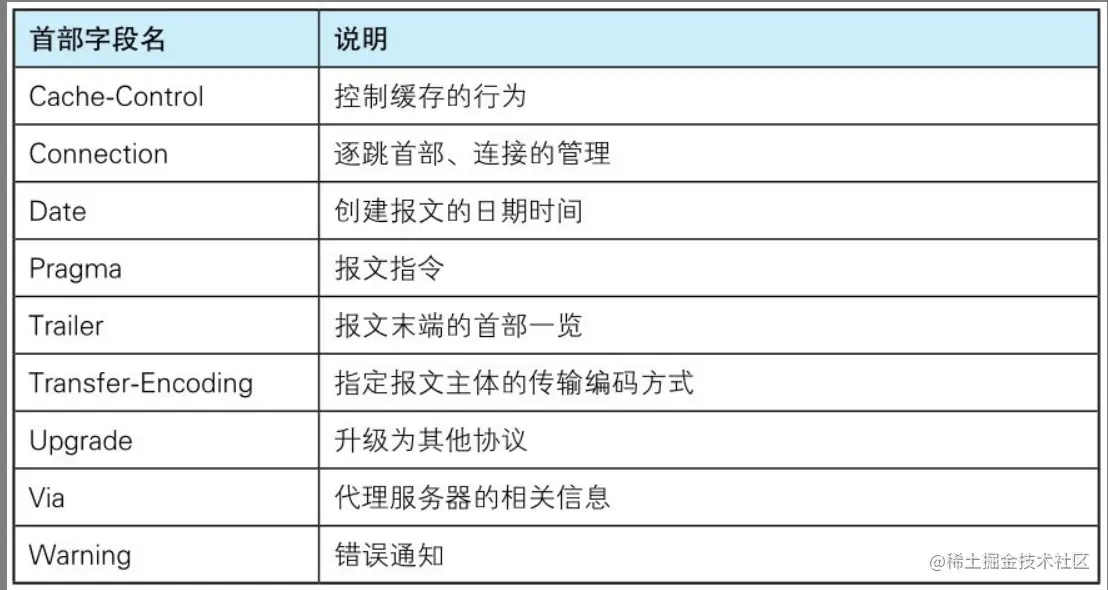分在此类别中的首部只对单次转发有效,会因通过缓存或代理而不再转发。HTTP/1.1和之后版本中,如果要使用hop-by-hop首部,需提供Connection首部字段。下面列举了HTTP/1.1中的逐跳首部字段。除这8个首部字段之外,其他所有字段都属于端到端首部。