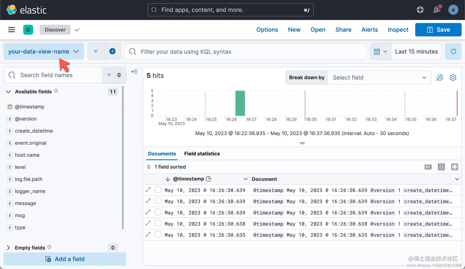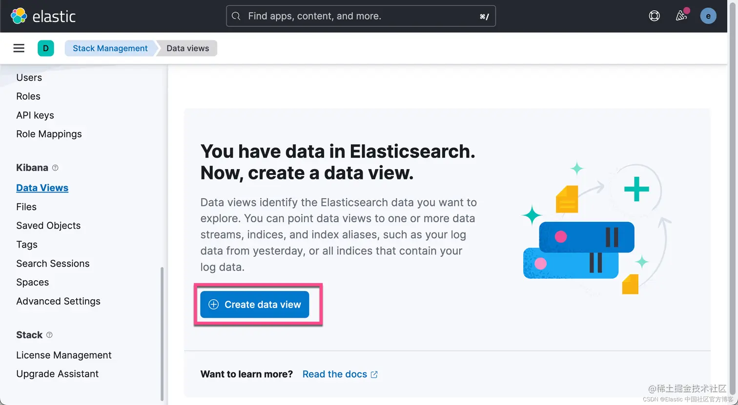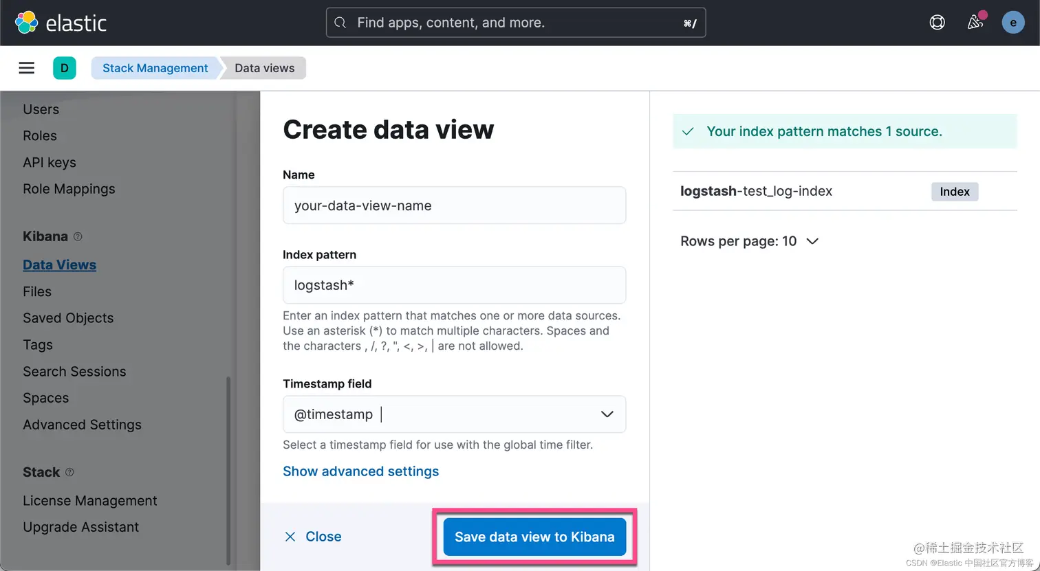 导航到 Management -> Stack Management -> Kibana -> Data View 为这些日志条目创建 data view。