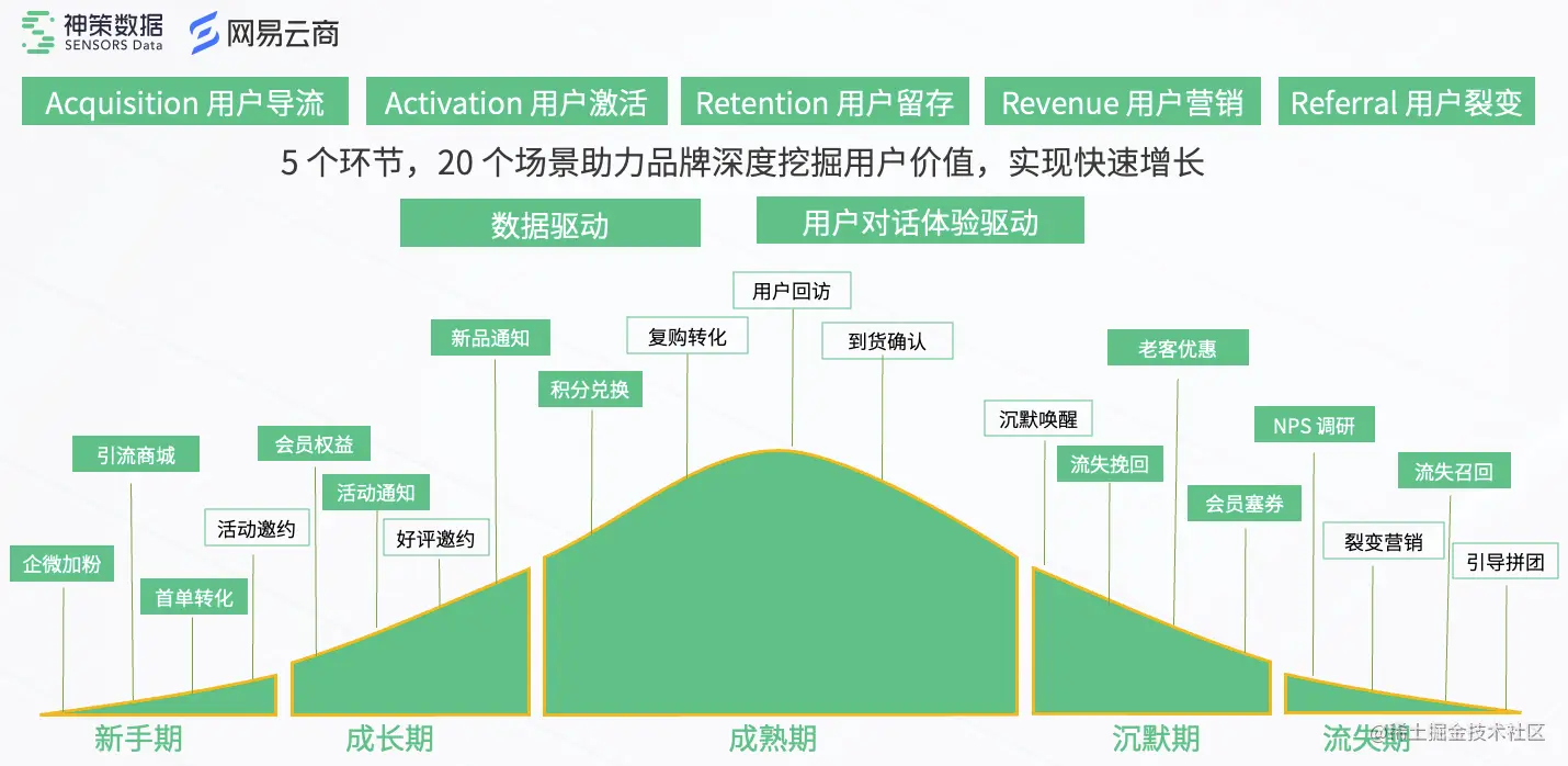 整体来看,神策数据与网易云商合作打造的智能营销解决方案能够覆盖用户的完整生命周期,包括新手期、成长期、成熟期、沉默期、流失期 5 个阶段,具体深入到 20 个场景内助力品牌深度挖掘用户价值,实现快速增长。