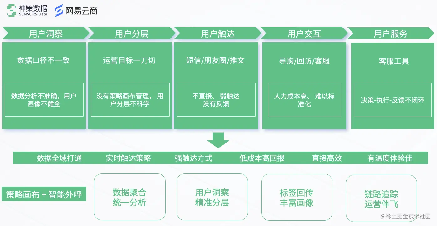 随着免费流量和付费流量的获取成本越来越高,企业开始寻找更高效率的获客方式;与此同时,聚焦存量用户,通过精细化运营等手段实现用户运营也成为企业发力数字化的另一重要方向。即围绕“用户”这一运营增长的核心,致力于全面实现用户洞察、用户分层、用户触达、用户交互和用户服务五大环节的业务增长。