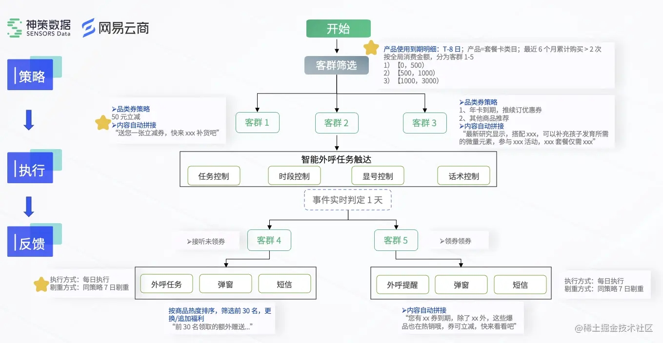 针对此,神策数据联合网易云商发布智能营销解决方案,面向鞋服、母婴、汽车、白酒等泛零售领域打造智能外呼系统,通过打通全域数据、制定实时营销策略,帮助企业全面深入用户运营场景完成精准营销,满足用户需求的同时,实现降本增效,达成经营目标。
