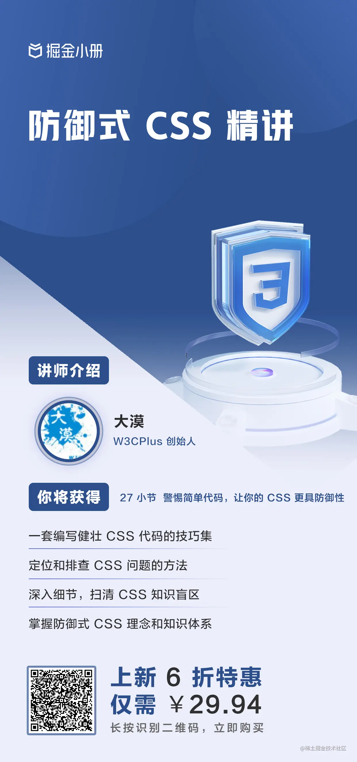 在这本小册中,大漠老师会把每个角度细化出来,保持上一本《现代 Web 布局》小册的图文加案例实战风格进行精讲,解析其中的原因和规避问题的方法。