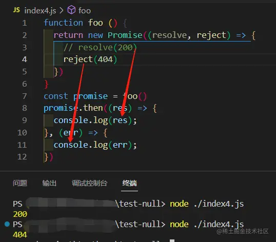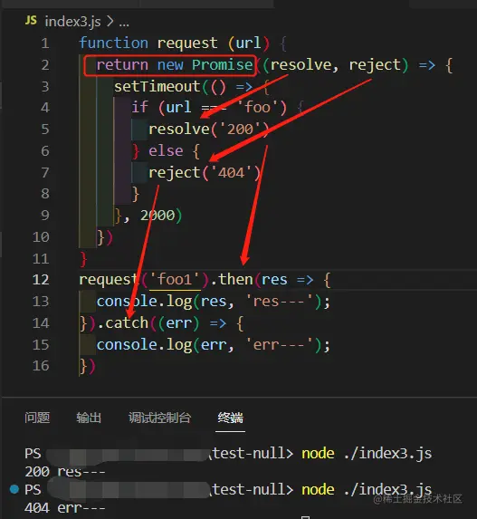 reject回调函数时,会执行Promise对象的catch方法传入的回调函数。