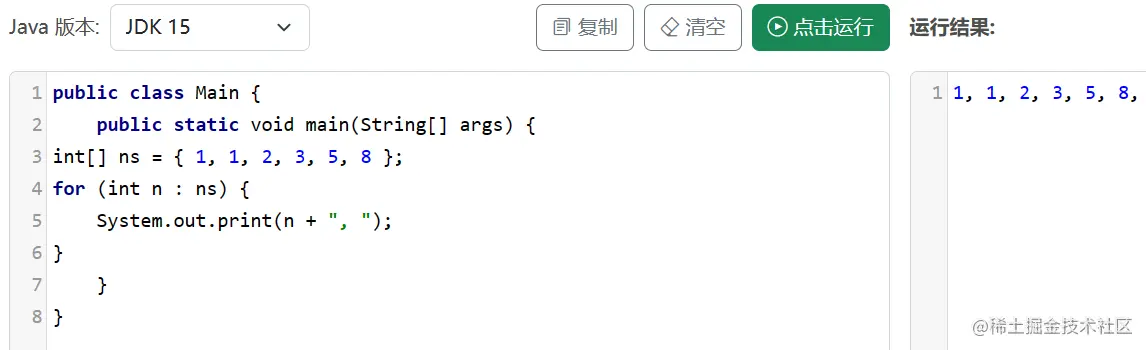 int[] ns = { 1, 1, 2, 3, 5, 8 };