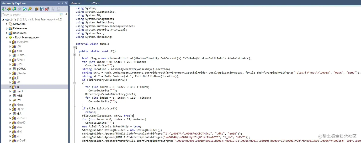 “白蛇”使用 C# 编写,对函数名、变量名等进行编码混淆防止静态检测: