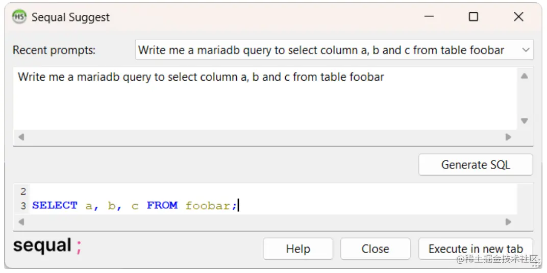 - 工具下的 Sequal Suggest 作为对话框的基本实现。用于通过自然语言生成 SQL 查询。参阅 sequal.dev/