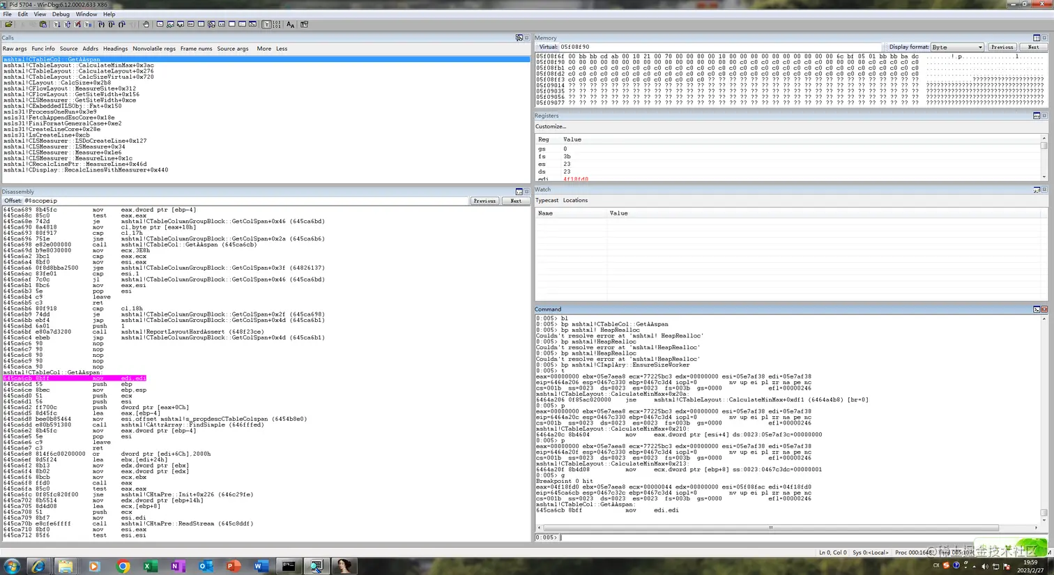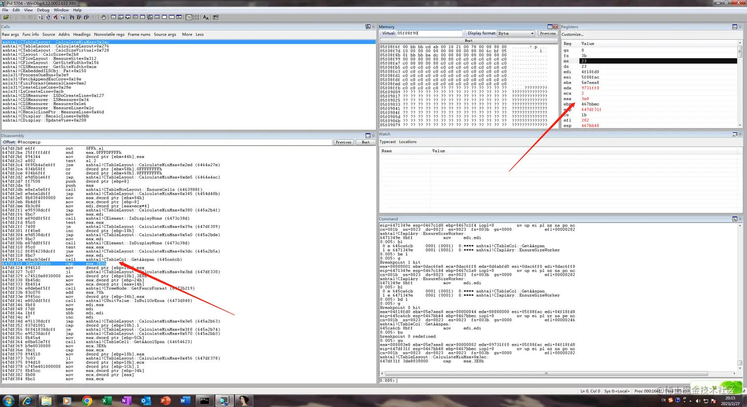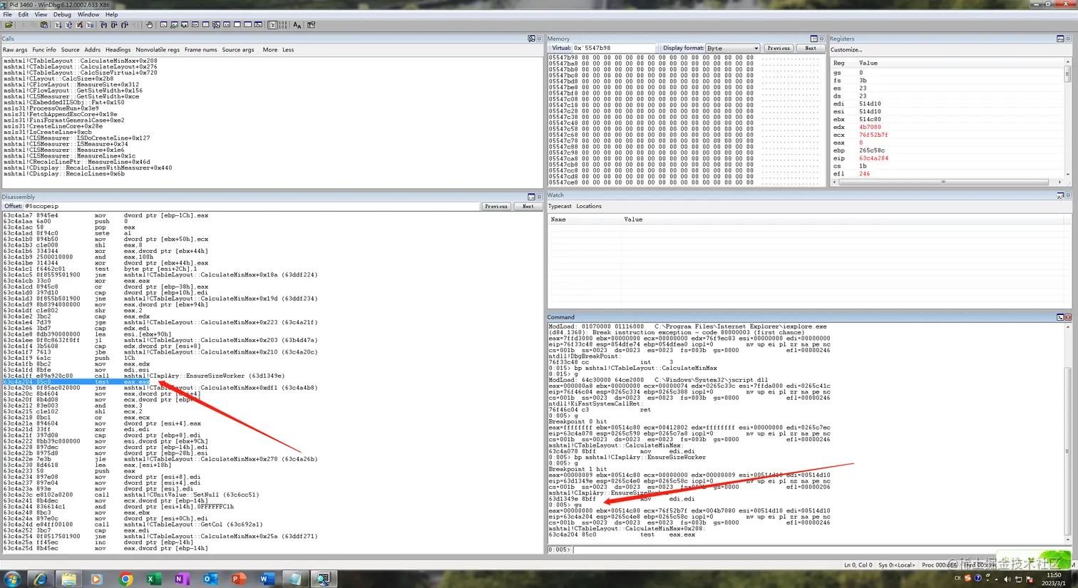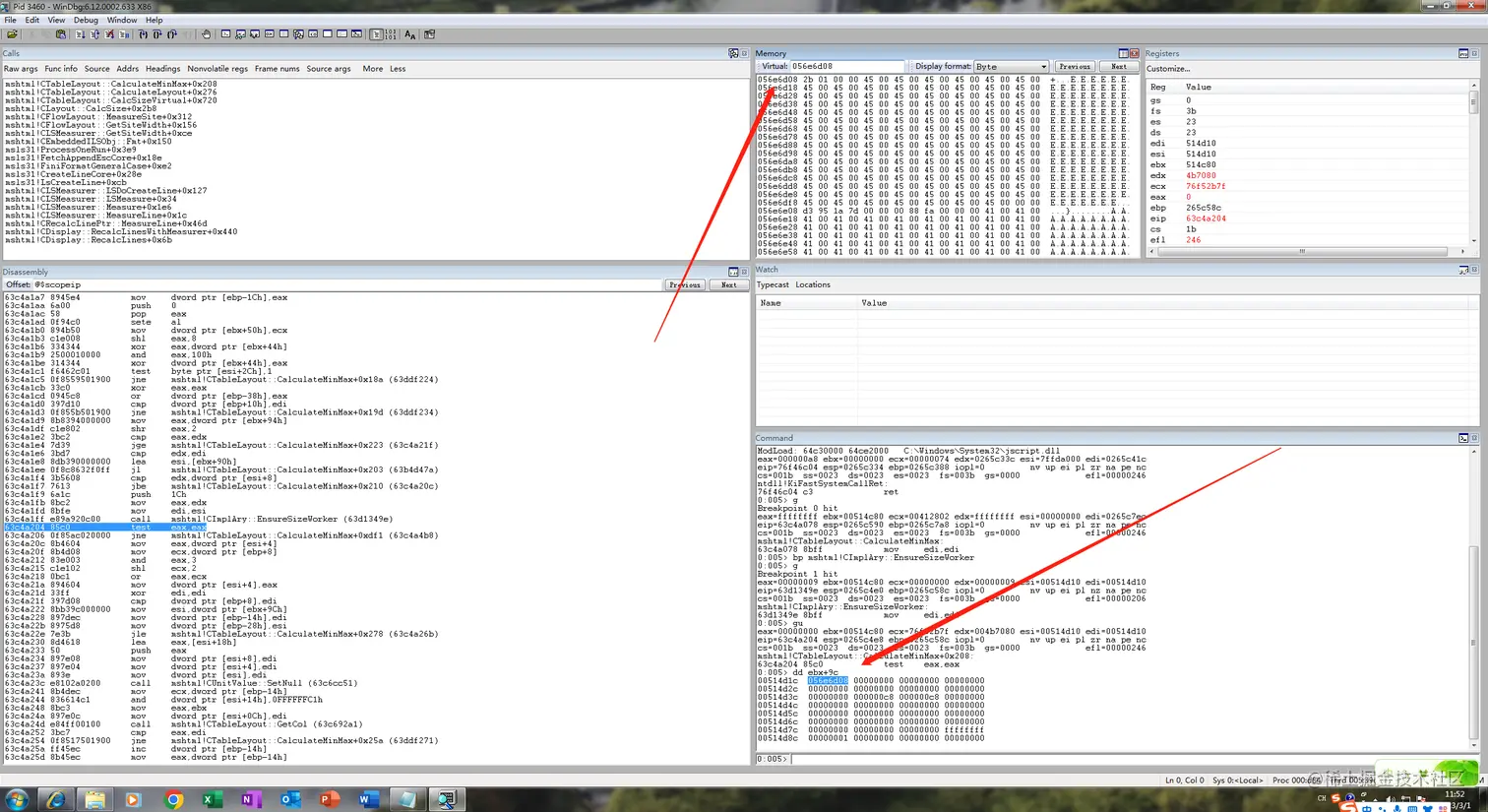 所以我们需要在mshtml!CTableLayout::CalculateMinMax函数下断点,看看溢出原因是什么,所以重新运行IE,用windbg附加IE,重复之前的操作,在附加之后对函数mshtml!CTableLayout::CalculateMinMax下断点,然后单步调试查找溢出原因:
