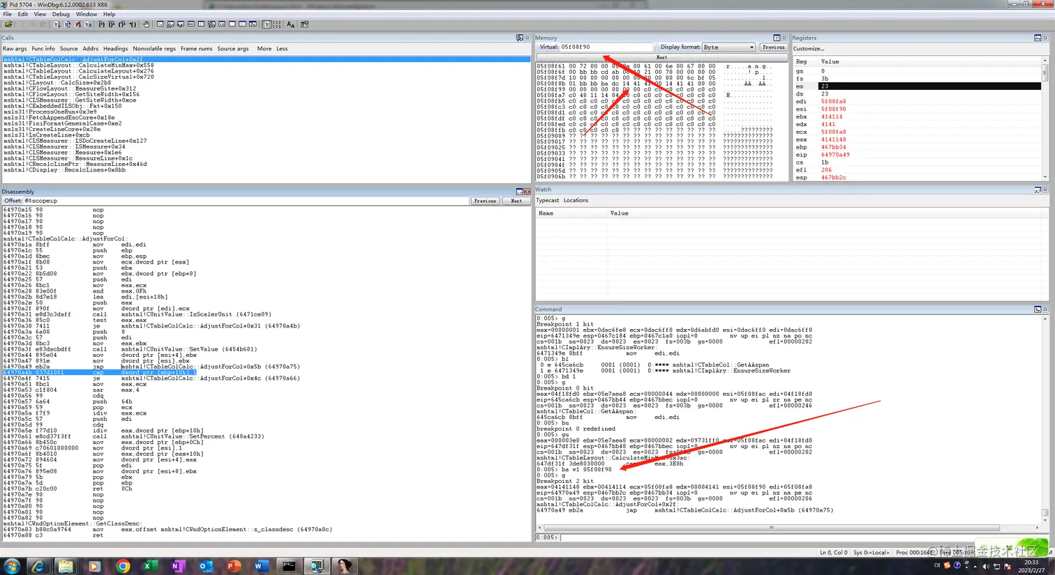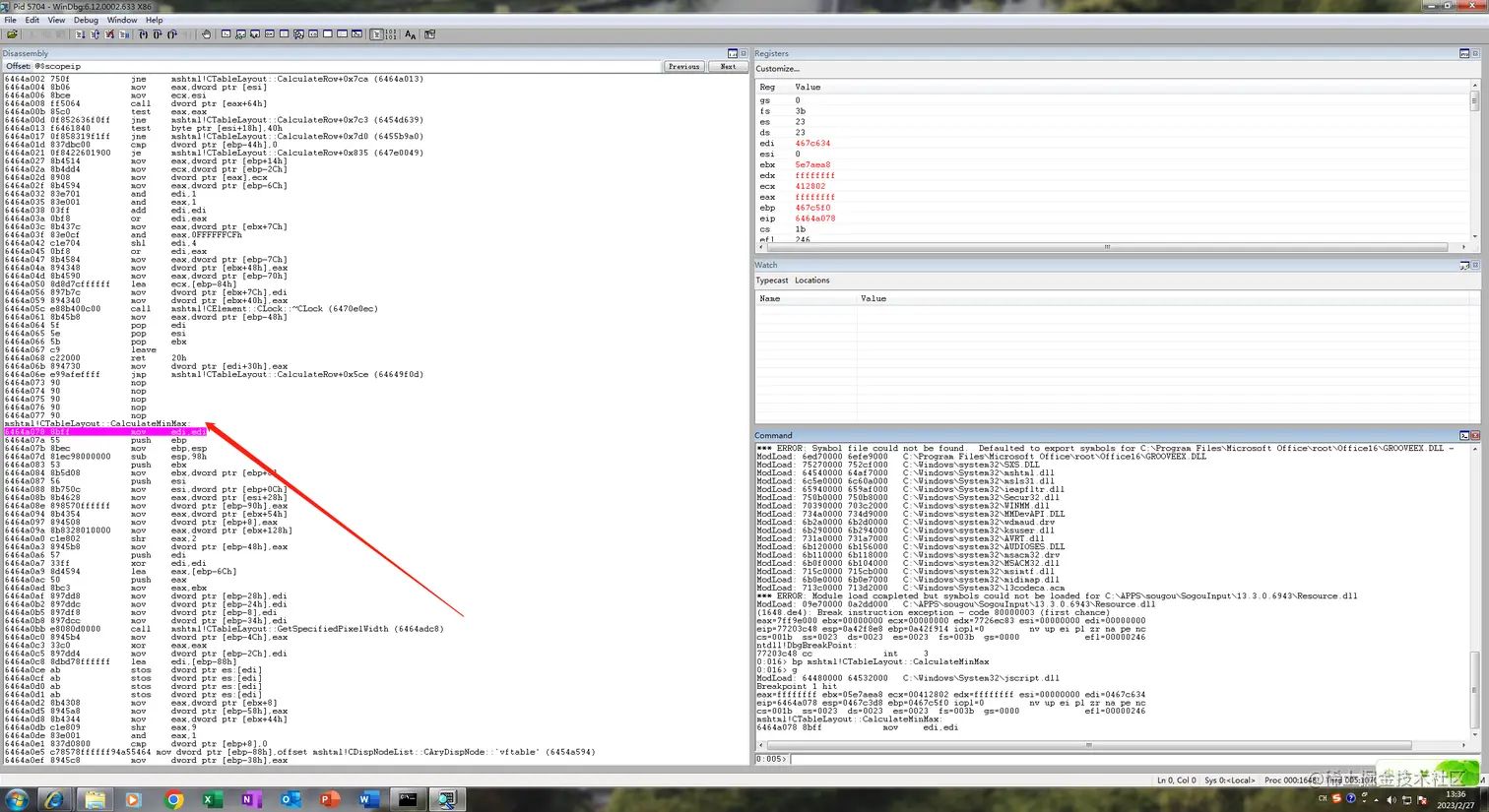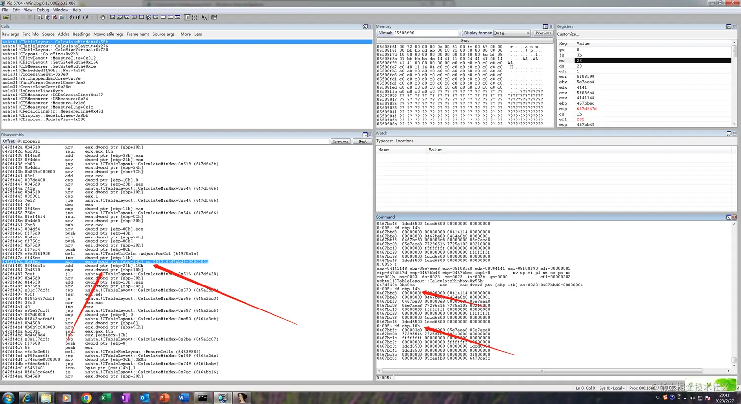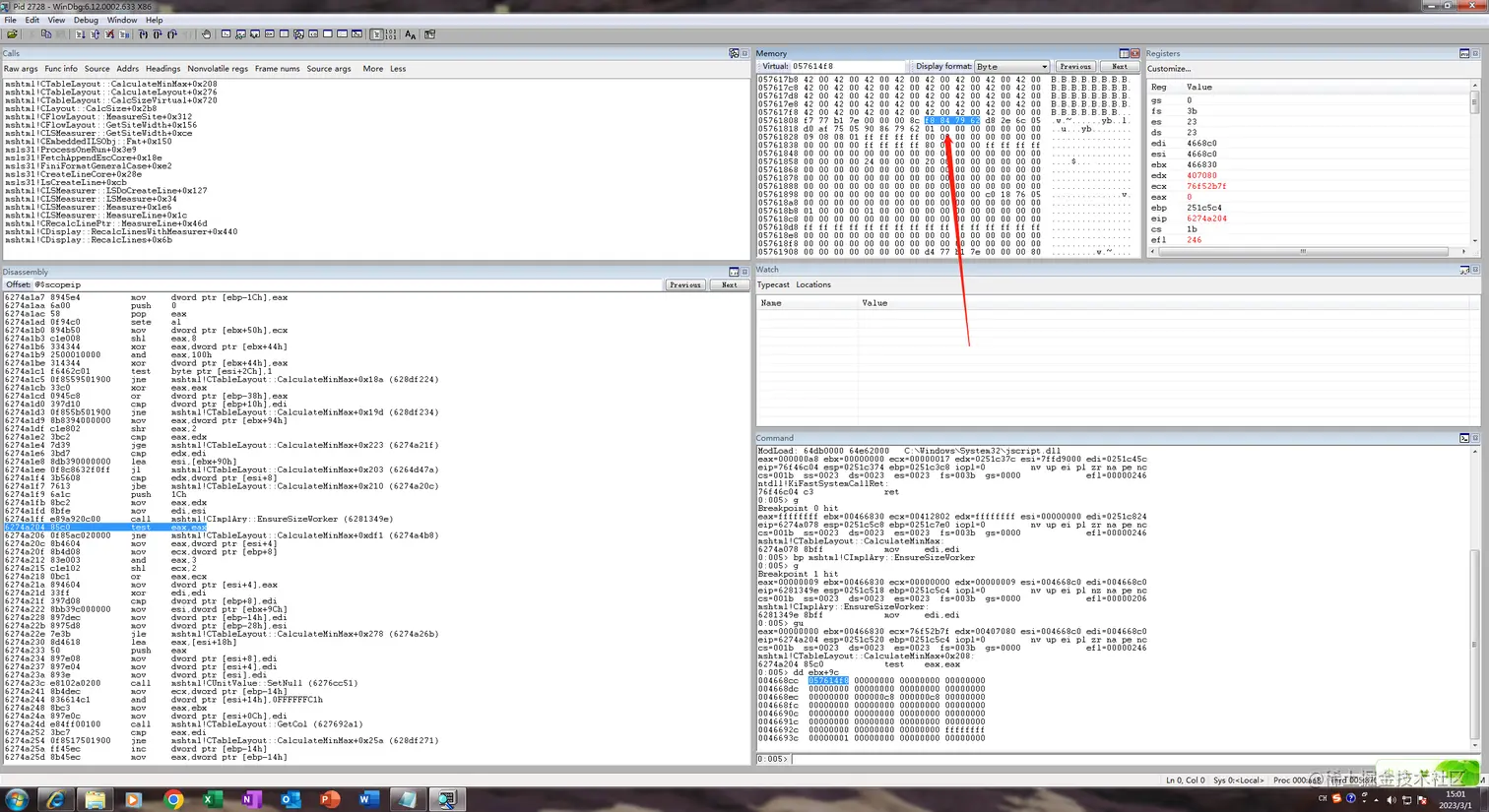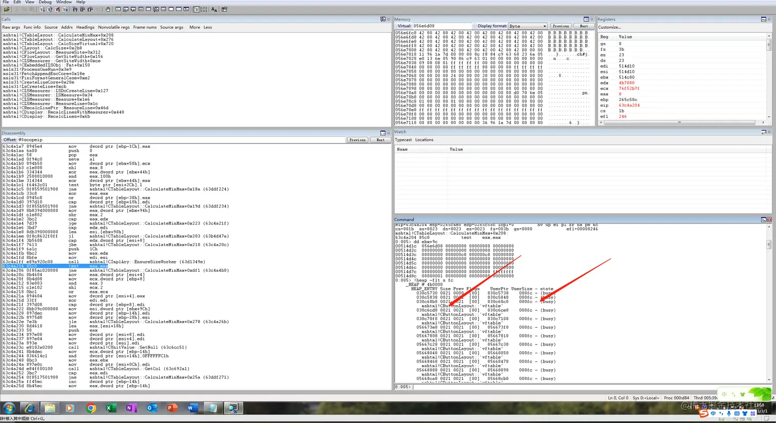 所以我们需要在mshtml!CTableLayout::CalculateMinMax函数下断点,看看溢出原因是什么,所以重新运行IE,用windbg附加IE,重复之前的操作,在附加之后对函数mshtml!CTableLayout::CalculateMinMax下断点,然后单步调试查找溢出原因: