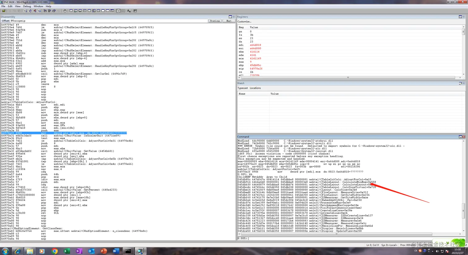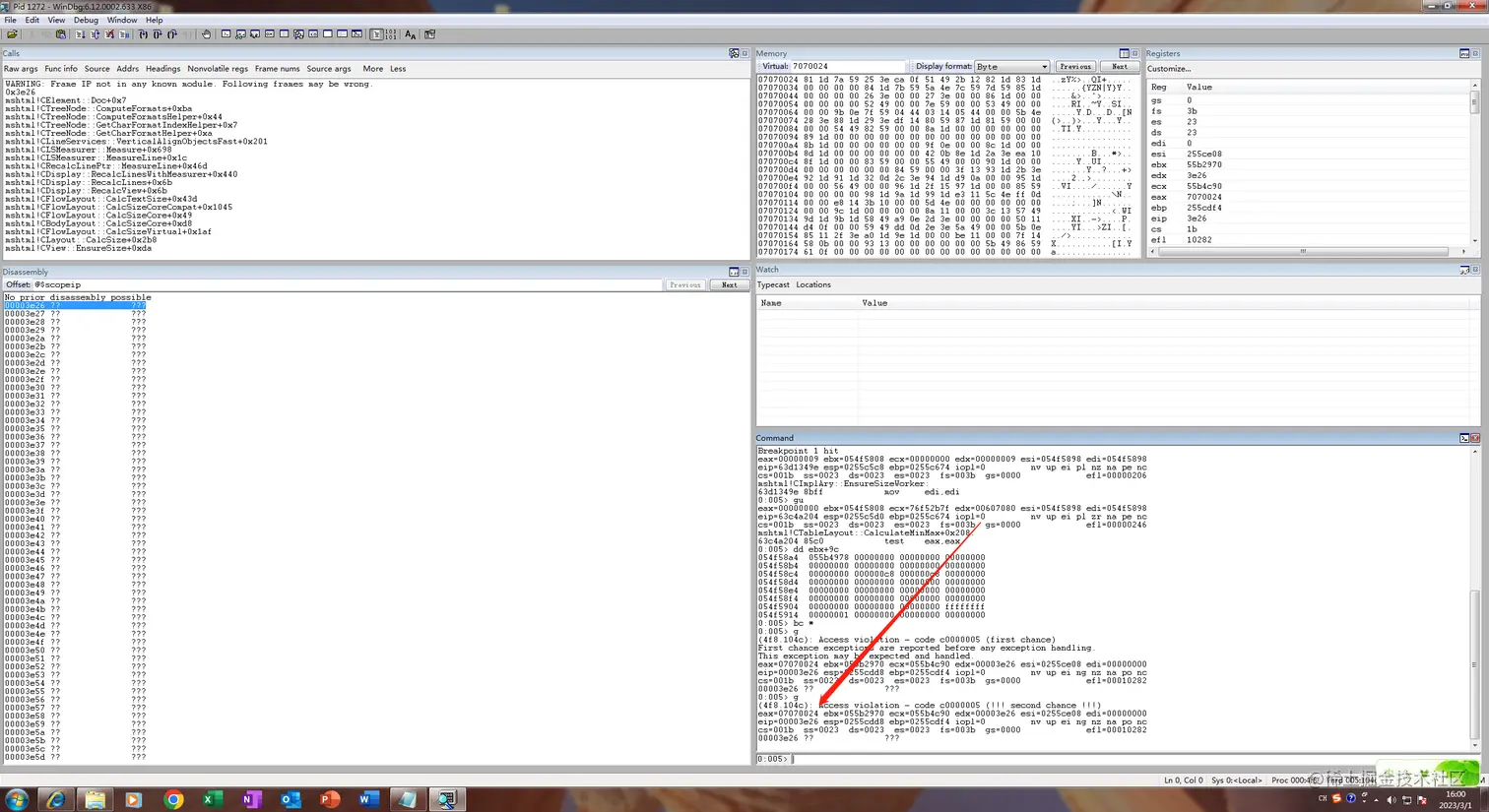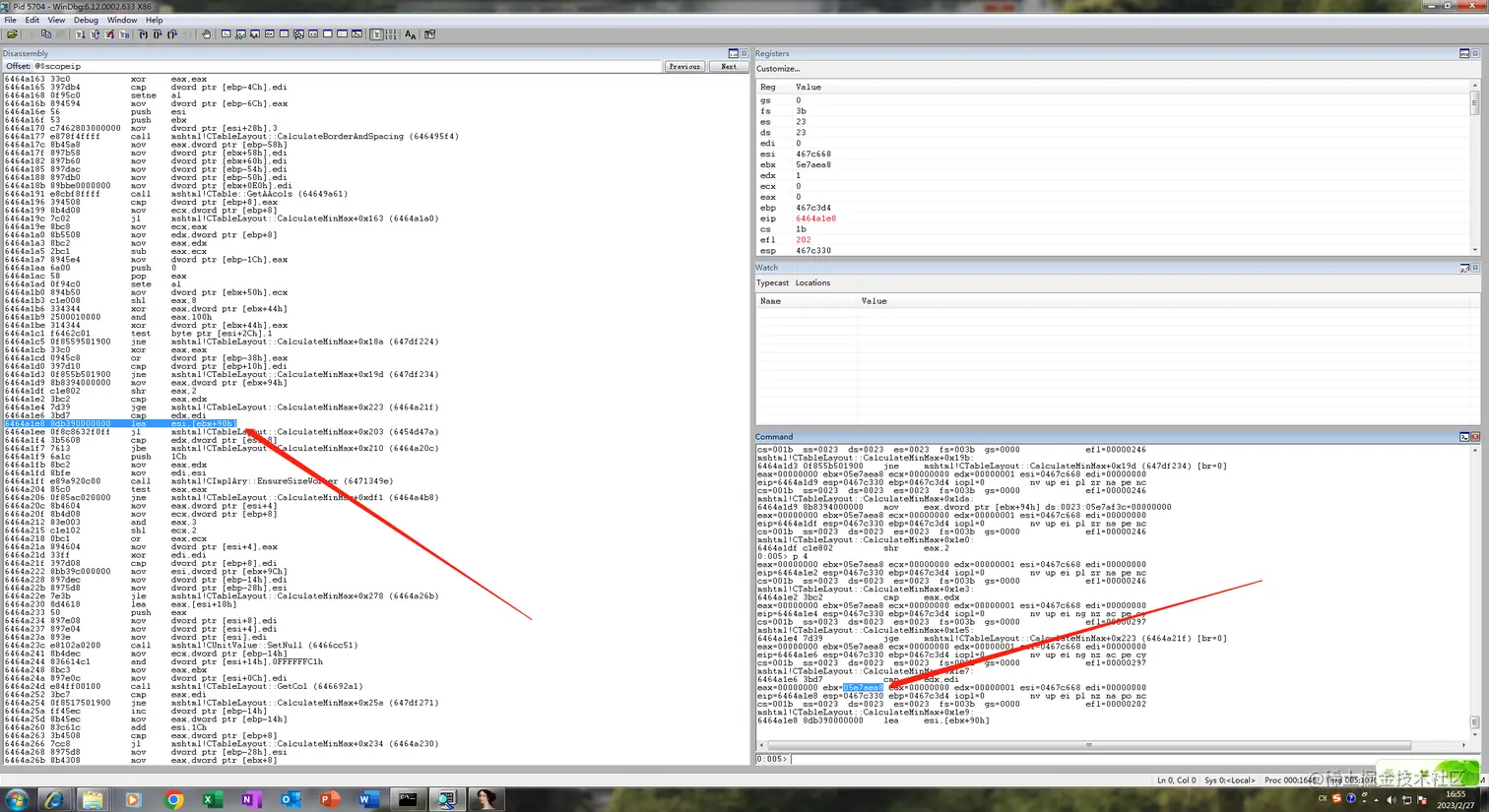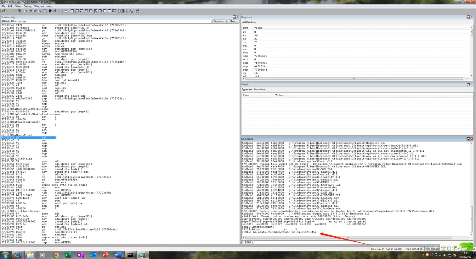 所以我们需要在mshtml!CTableLayout::CalculateMinMax函数下断点,看看溢出原因是什么,所以重新运行IE,用windbg附加IE,重复之前的操作,在附加之后对函数mshtml!CTableLayout::CalculateMinMax下断点,然后单步调试查找溢出原因: