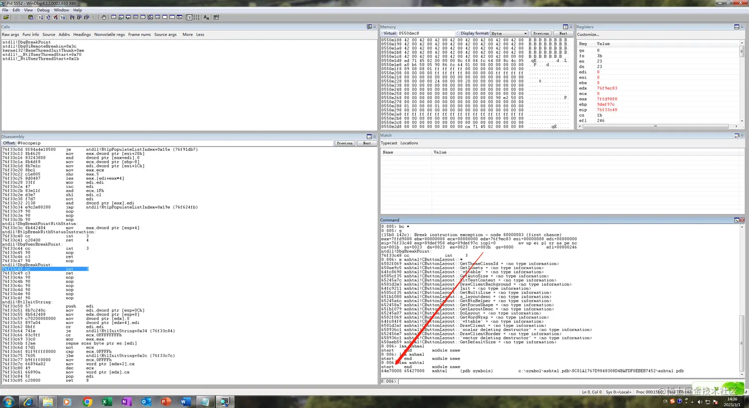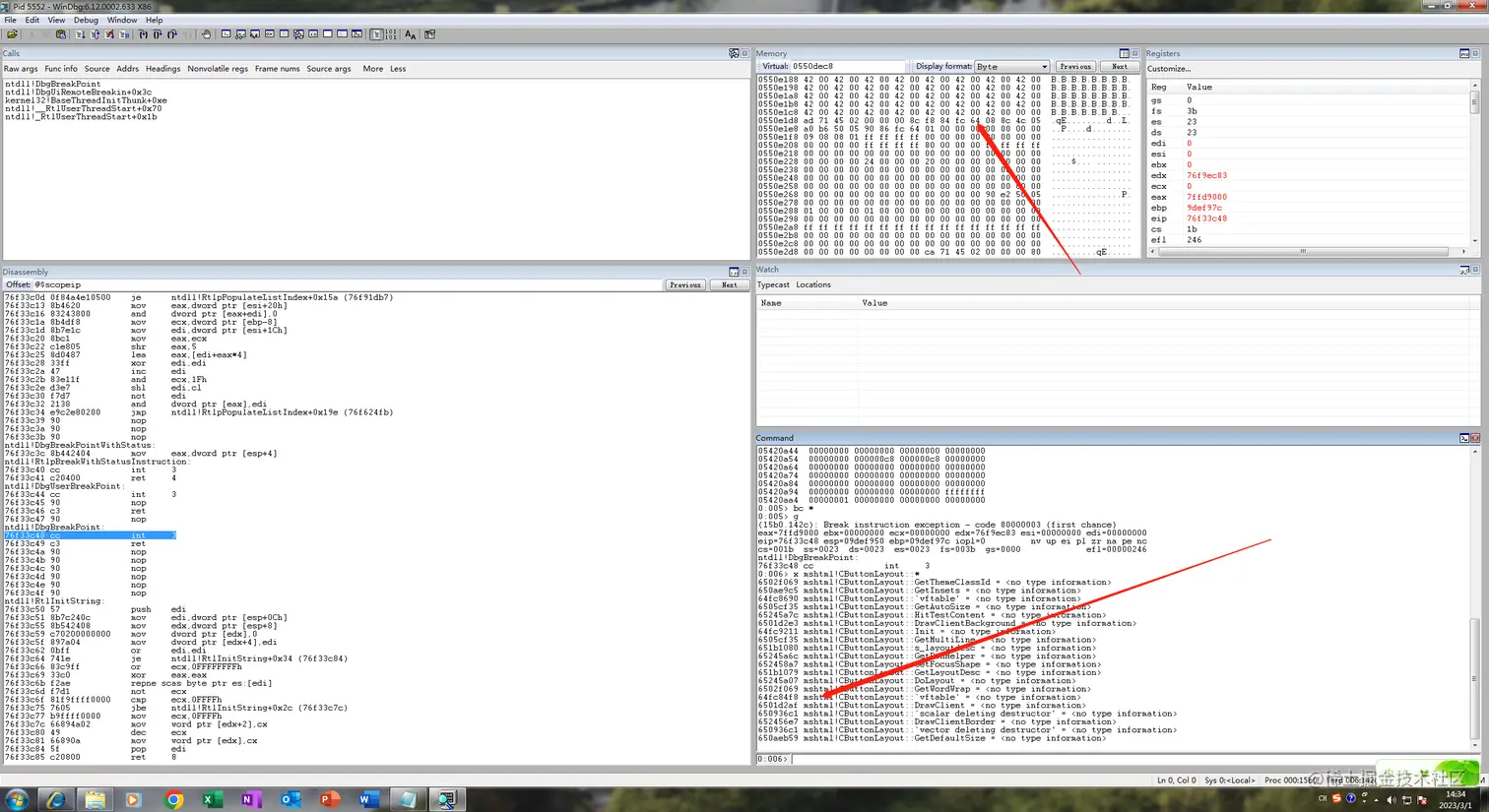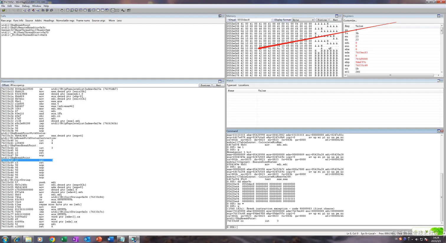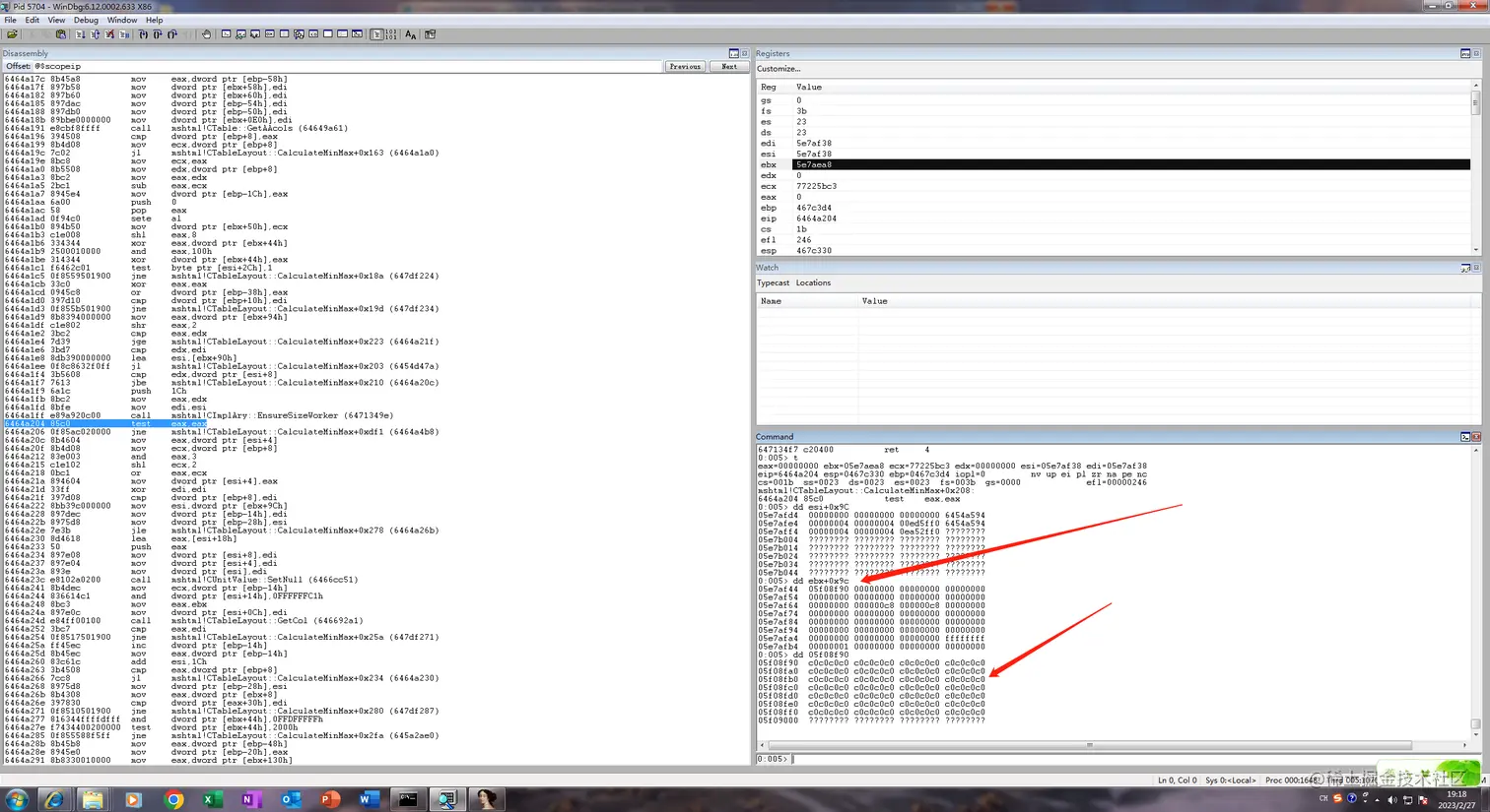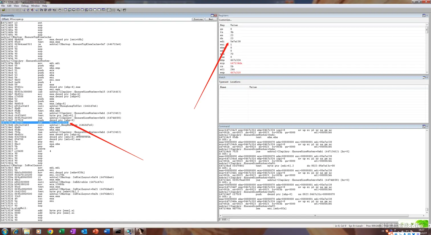继续F8走,看箭头位置,又把edi+0Ch给了esi,所以这里堆的地址是ebx+9c:
