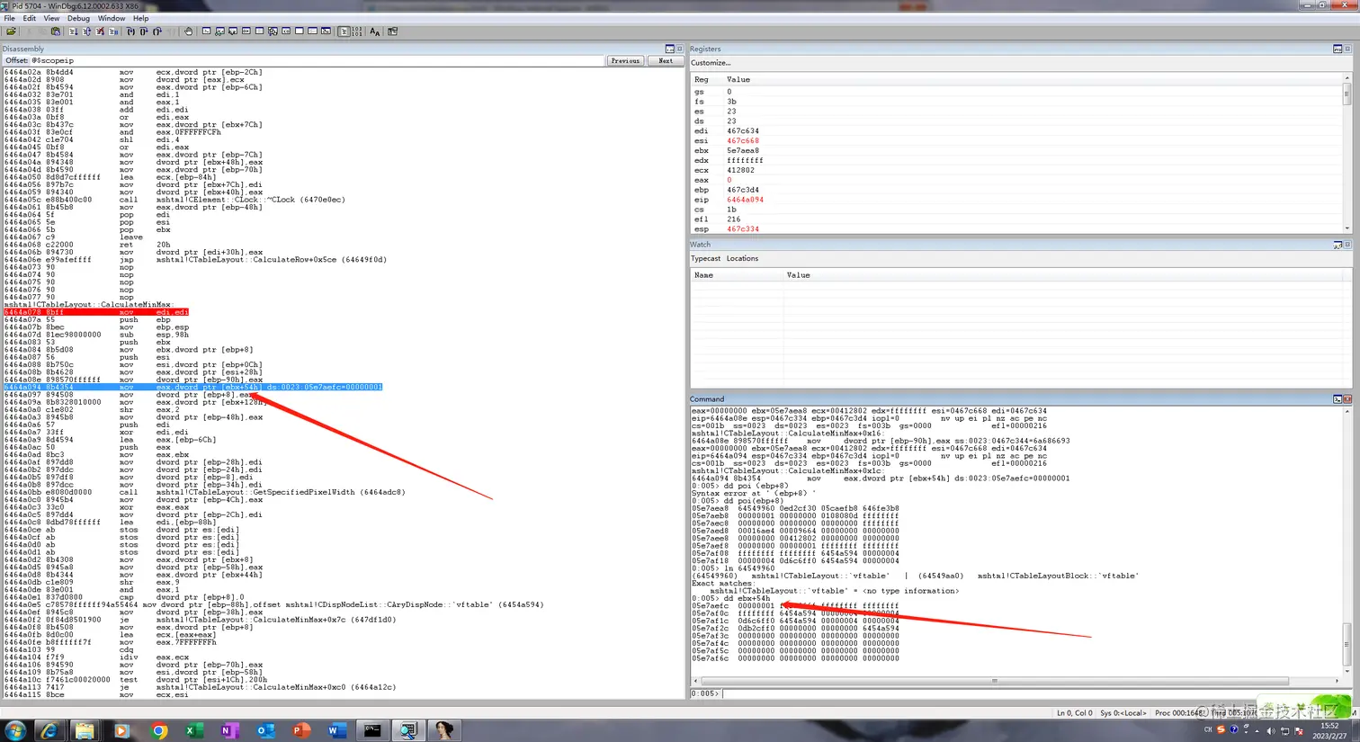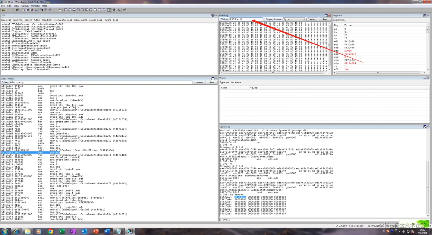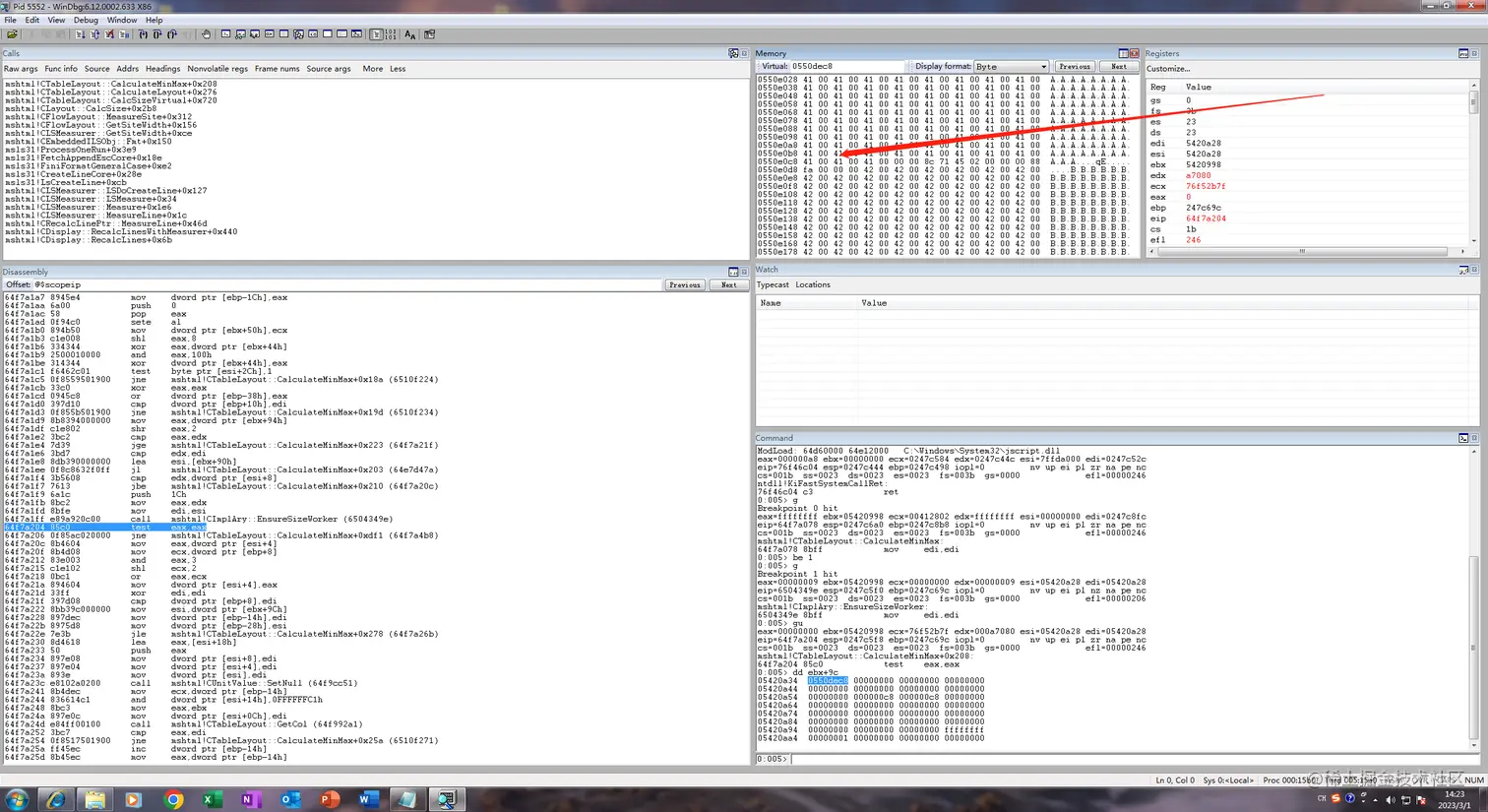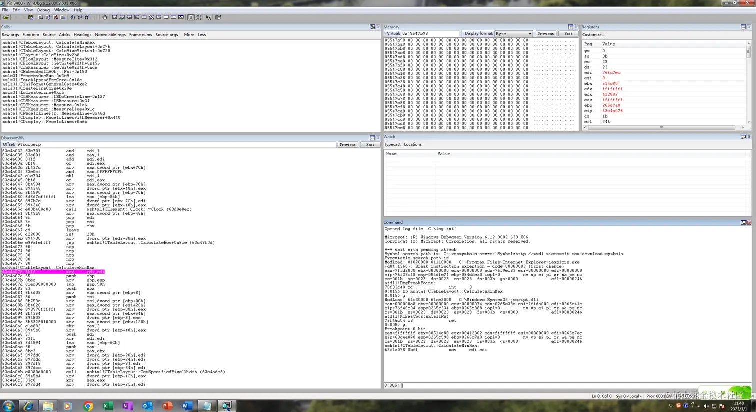接下来就是使用前面这段代码,改后缀为html,双击打开,使用windbg附加,先对mshtml!CTableLayout::CalculateMinMax下断点,然后go起来,直到断点断在mshtml!CTableLayout::CalculateMinMax函数上面: