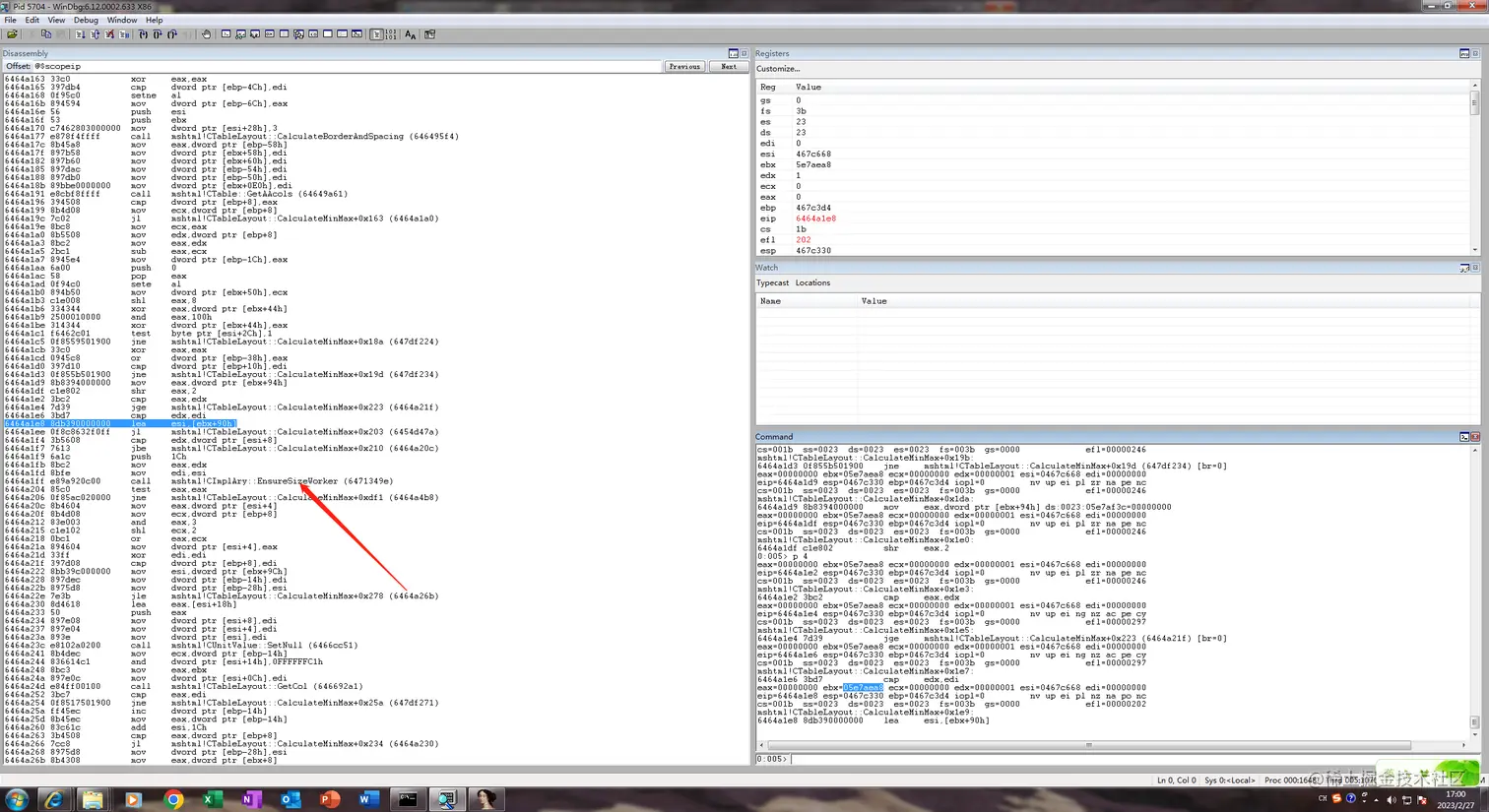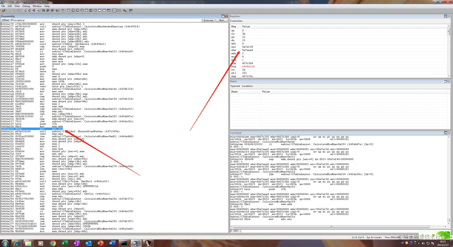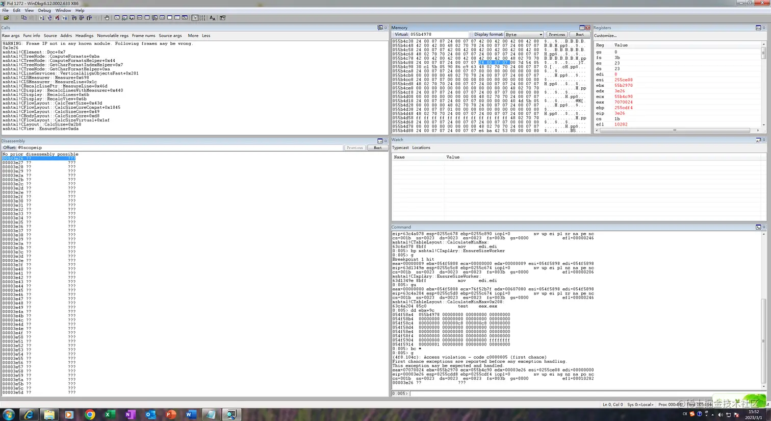 接下来就是使用前面这段代码,改后缀为html,双击打开,使用windbg附加,先对mshtml!CTableLayout::CalculateMinMax下断点,然后go起来,直到断点断在mshtml!CTableLayout::CalculateMinMax函数上面: