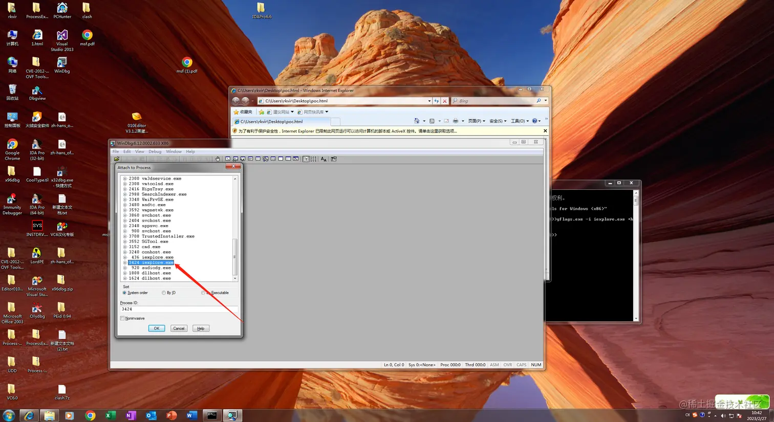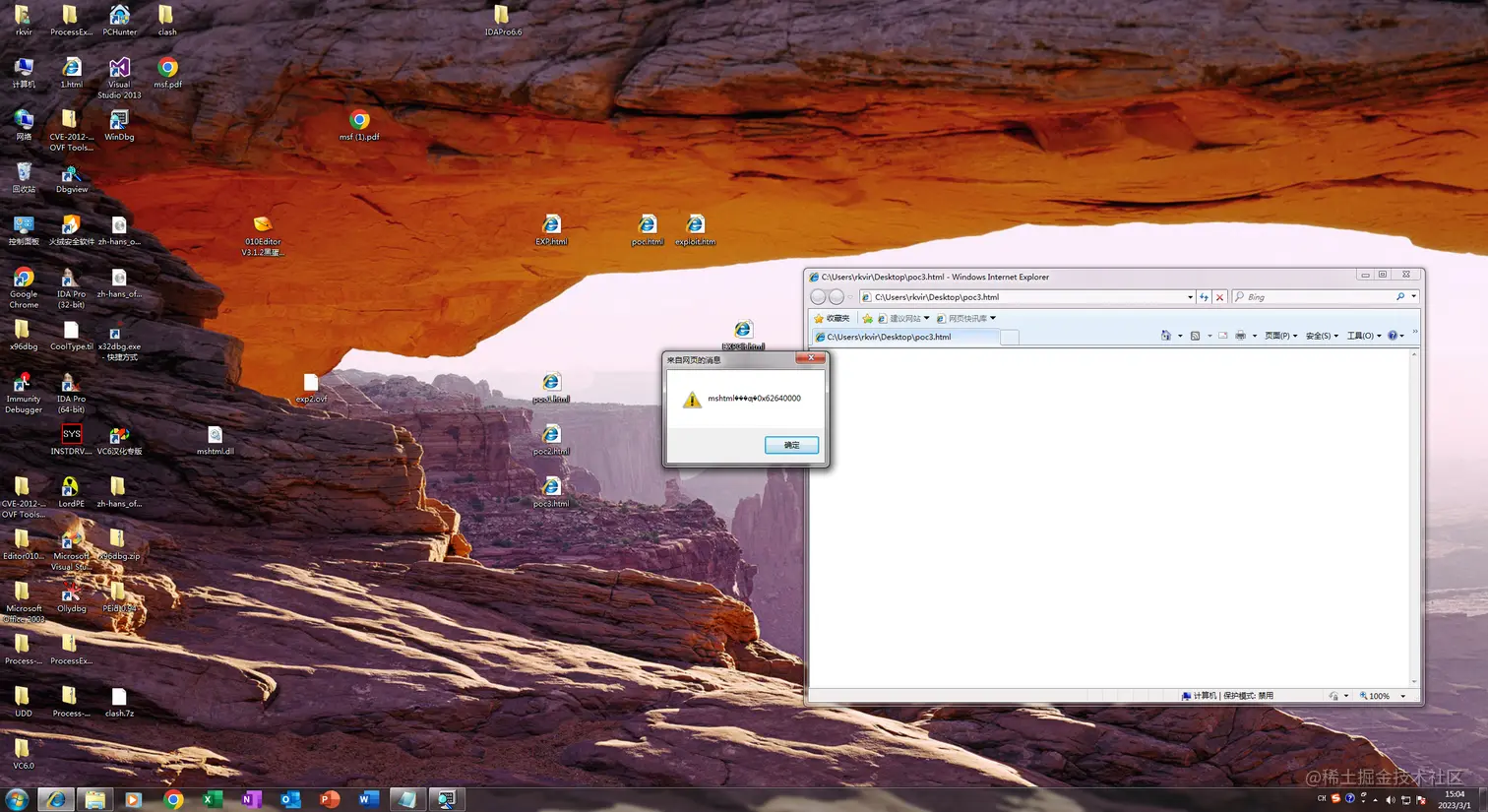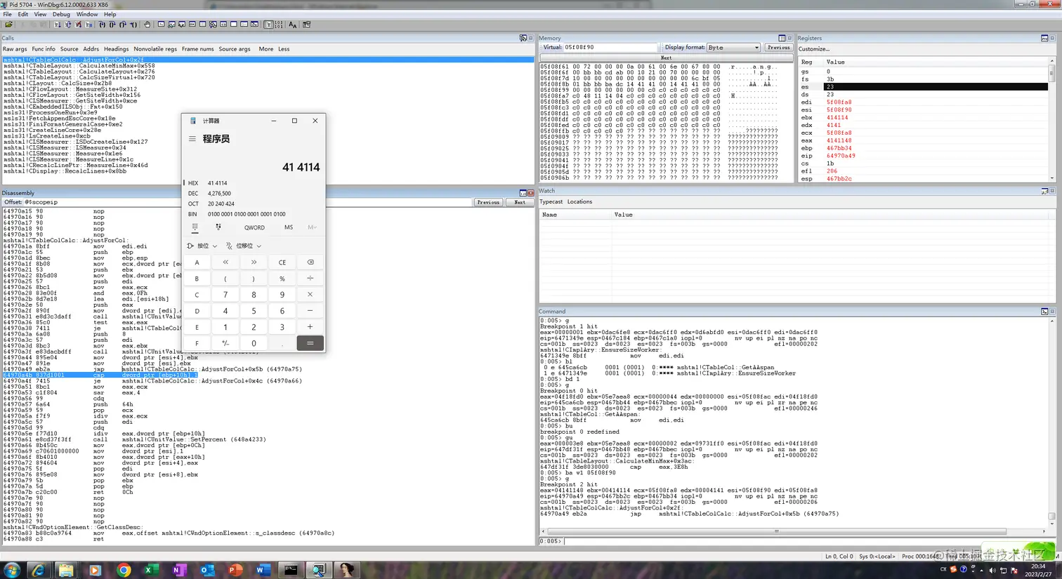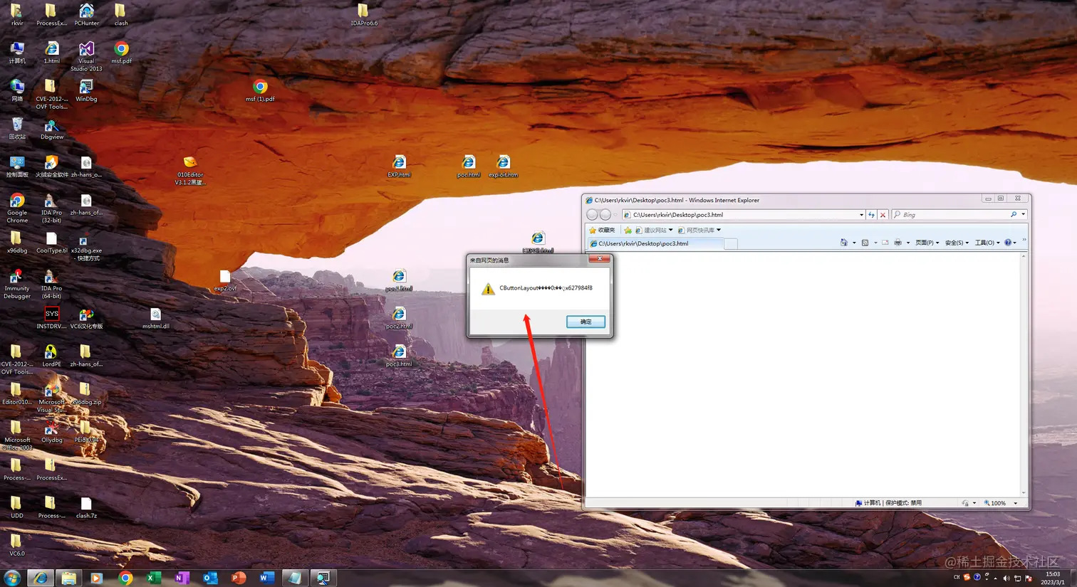 接下来就是使用前面这段代码,改后缀为html,双击打开,使用windbg附加,先对mshtml!CTableLayout::CalculateMinMax下断点,然后go起来,直到断点断在mshtml!CTableLayout::CalculateMinMax函数上面: