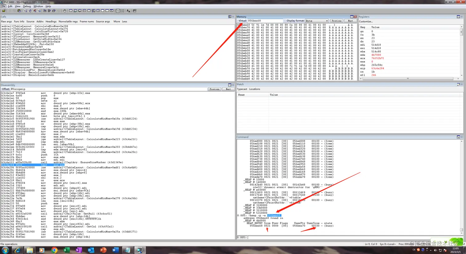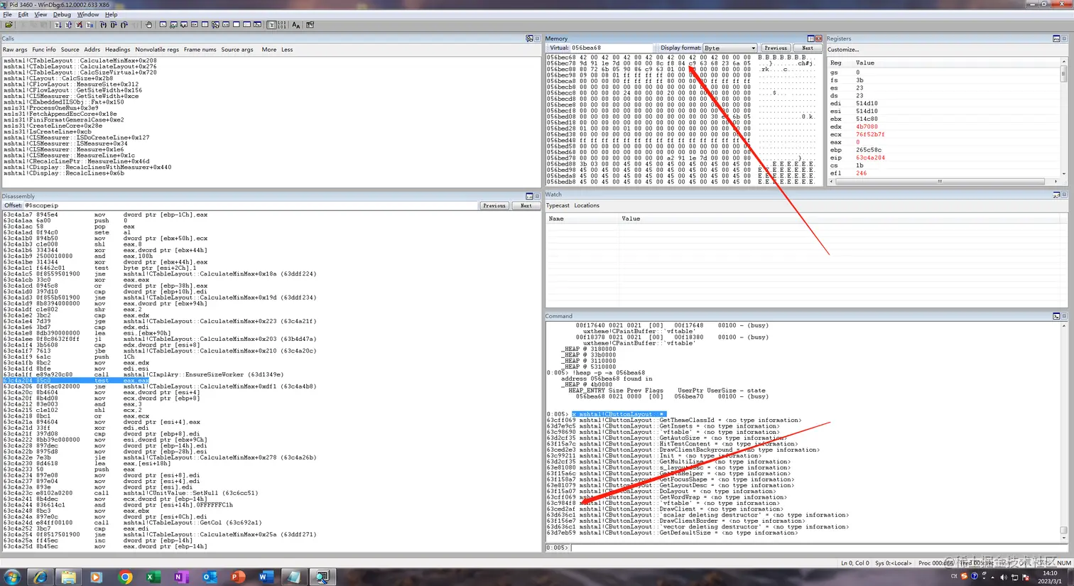 简单计算一下,19* 1ch=214h。214h-108h* 2=4字节(108h是100堆大小+8h字节头信息),所以这里会覆盖BBB堆块前四个字节;接下来使用新的POC验证一下,还是先下mshtml!CTableLayout::CalculateMinMax断点,断在这里在下mshtml!CTableLayout::CalculateMinMax,随后gu走出申请空间函数,这里ebx+9Ch就是申请的堆块地址:
