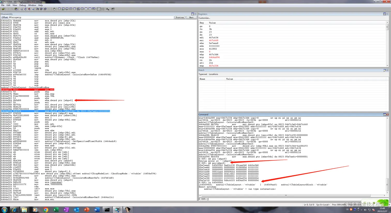 在这里看箭头位置,可以看到ebp+8是第一个参数,赋予eax,也就是 theTableLayoutobj 。通过符号,也可以看出确实是引用CTableLayout对象,也就是标签在内存中的对象。再看: