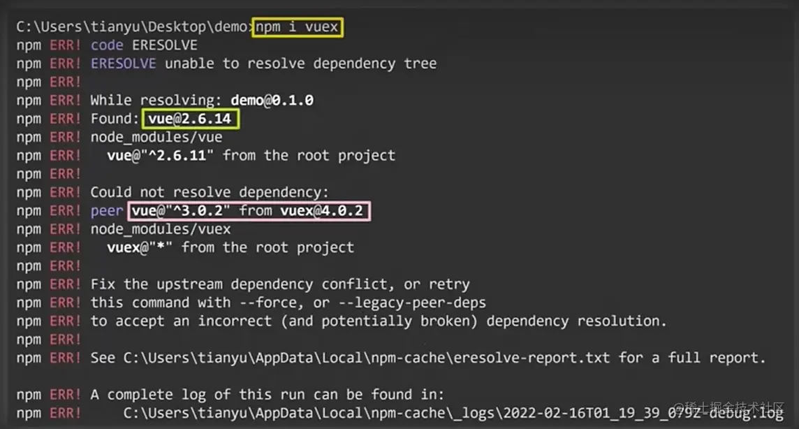 安装之前需要了解一个版本问题,在vue2中,要用vuex的3版本,在vue3中,要用vuex的4版本,要严格遵循这个版本要求,不然就会出现各种意想不到的问题,例如下方安装报错,就算因为版本问题