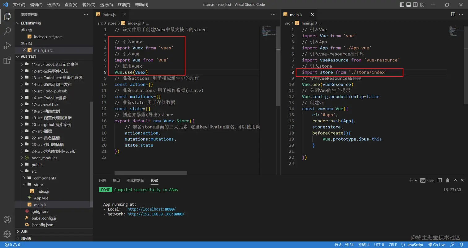 这时候我们可以换一种思路,把use写道index.js里面,让main.js只需要引入以及准备好的store