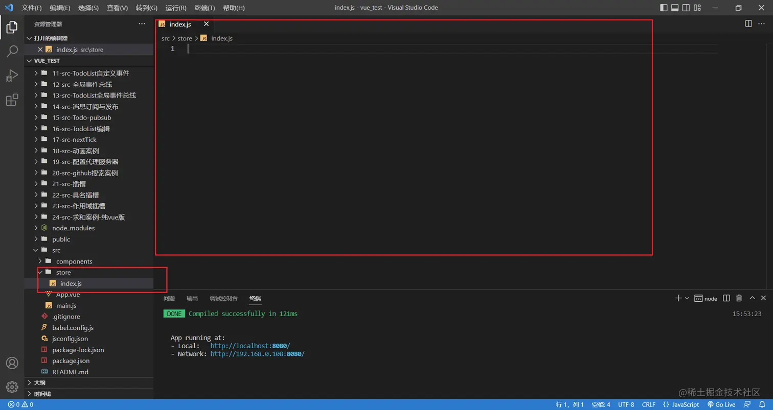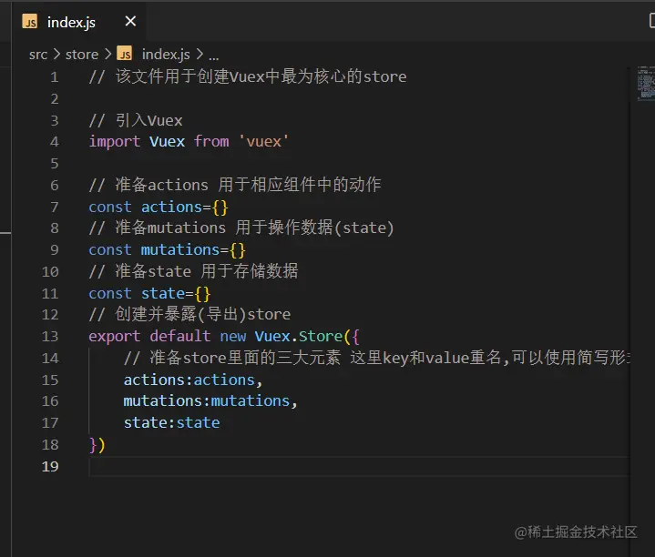 在项目的src目录创建一个叫store的文件夹,并且创建index.js,虽然没有体现vuex,但是在src里面看到store,就相当于看到了vuex,这种方式也是官网推荐的