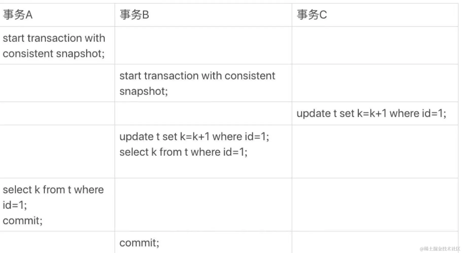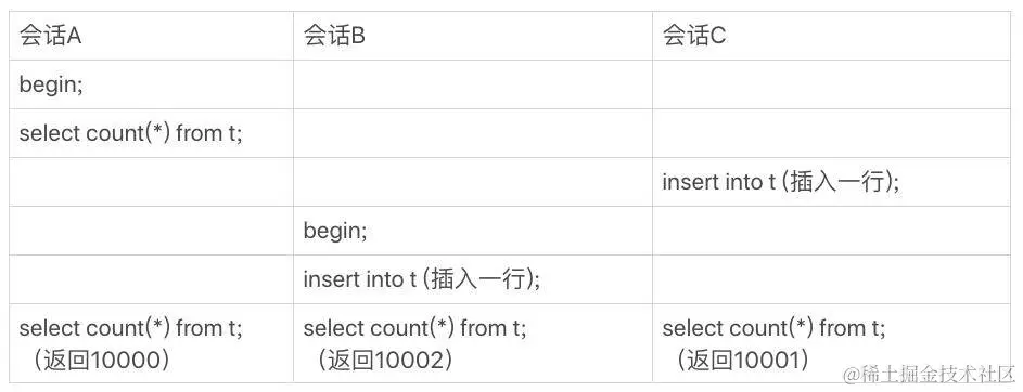 在这个例子中,不同的会话启动了不同的事务,也启动了不同的视图,每个视图最后返回的结果都是不同的,A返回10000,B返回10002,C返回10001