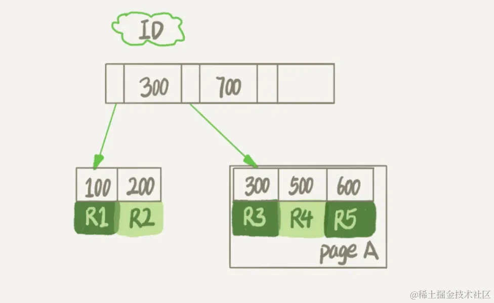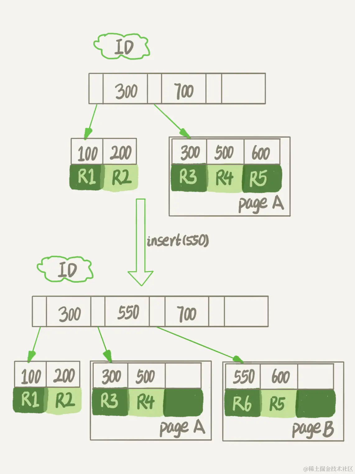 所以删除数据会造成一个“空洞”问题,什么是空洞呢?简单的来说就是标记为了“可复用”状态,但是一直没有被利用。不止是删除数据会导致“空洞”,插入数据也会,如果我们的数据是根据索引递增插入的,那么索引还是紧凑的,但是如果数据是随机插入的,那么可能会造成索引的数据页分裂,分裂之后空出来的没有被利用的空间就是空洞。如下图中的pageA中R4后面没有被利用的空间。这也是为什么要求数据主键ID要递增也不是随机的原因。