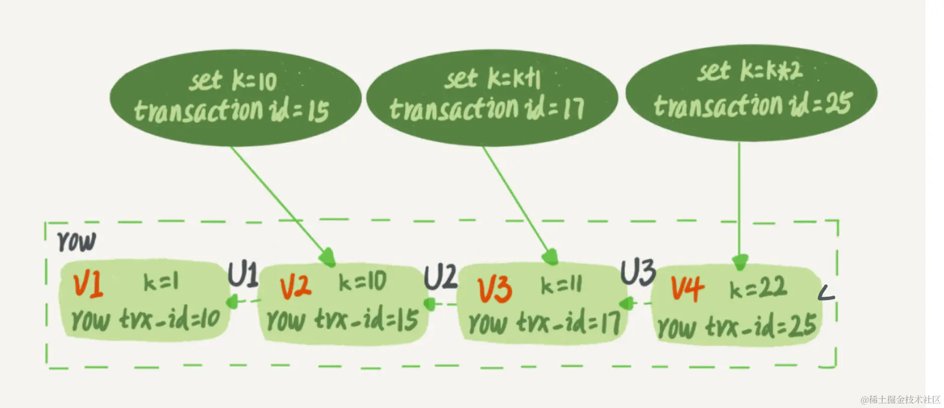 我们每条记录在更新的时候都会同时记录一条回滚记录。在这个记录中,通过回滚记录可以回滚到前一个位置。