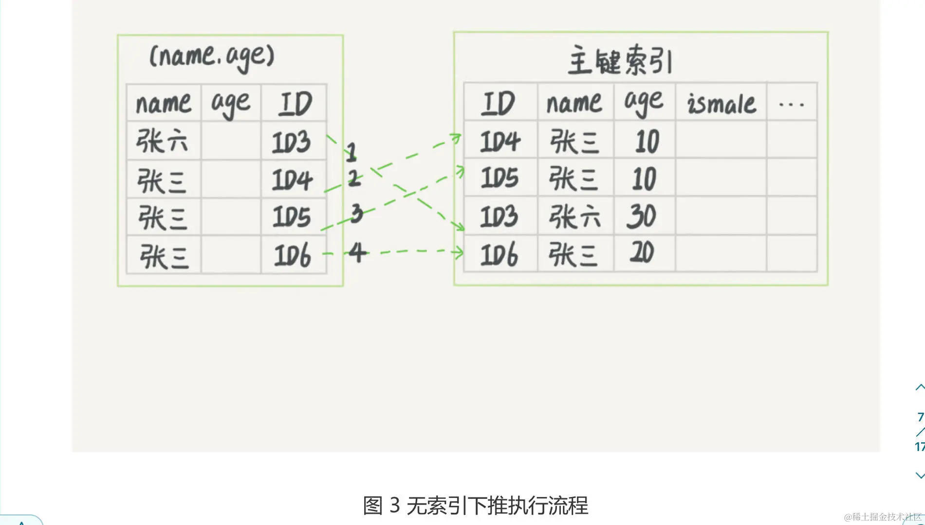 在MySQL5.6之前没有索引下推,会去检索到第一个满足name是张开头的数据,也就是ID3开始,然后再去主键索引中进行回表然后再判断age是不是=10,这样得话会进行很多次的回表操作。