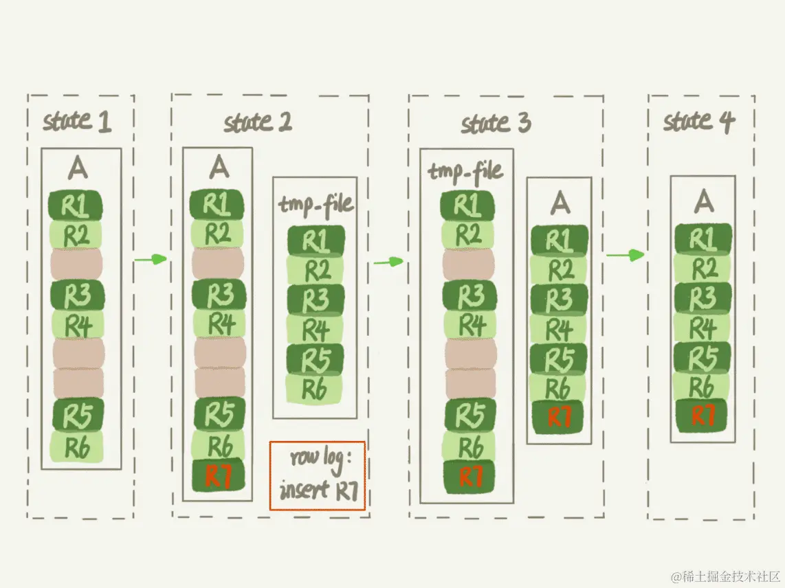 上图是MySQL5.6之后的一个优化的流程。你会发现在这个流程中多了一个row log日志,会将重建表到新表过程中对原始表的更新操作记录到这个日志文件中,然后重建完了之后将这个row log日志中的操作更新到新表中。所以称这个DDL 为online的。而且上述流程中产生的临时表是存放在innodb内部的,不是在server层。而且你还要注意,如果在重构时进行的操作也是可能造成也分裂和空洞的