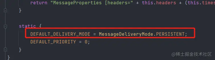 在MessageProperties中,有个deliveryMode属性,该属性默认值为:MessageDeliveryMode.PERSISTENT(持久化的)