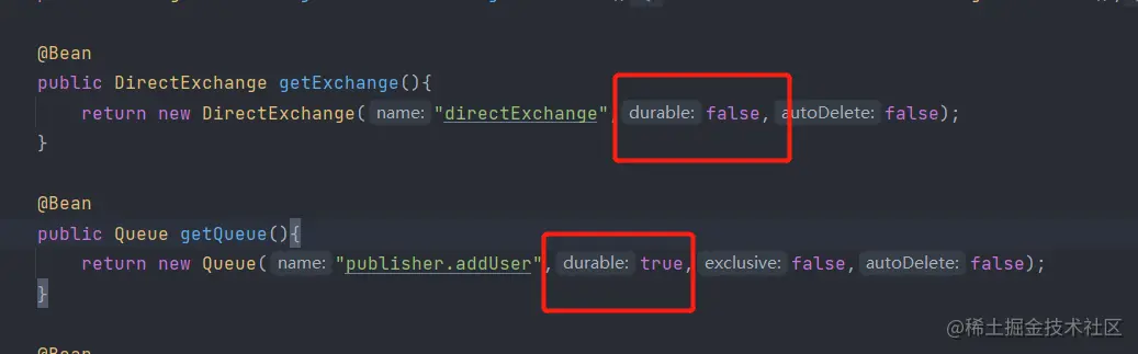 我们在SpringBoot项目中使用spring-boot-starter-amqp 声明的交换机、队列、消息默认都是持久化的。而交换机和队列的持久化从上述代码中可以看到是通过指定durable的值。