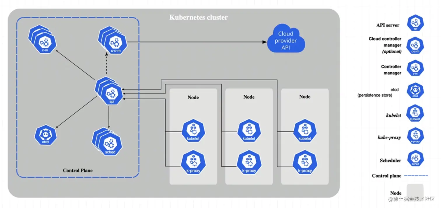 在上篇文章【云原生 • Kubernetes】(一) 初识 Kubernetes - 掘金 (juejin.cn)中,我们介绍了 Kubernetes 是什么,它能够对容器进行编排,也就是说是容器的管理者,为容器做负载均衡、挂载存储系统、自动化部署和回滚、自我修复、自动装箱,那么 Kubernetes 是如何做到这些的呢?这就不得不提到 Kubernetes 的下面的这些重要组件了: