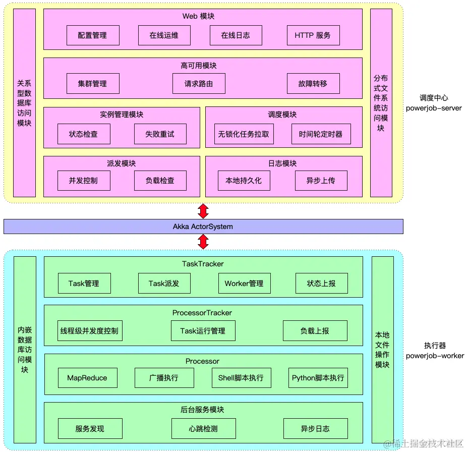 从架构图颜色可以看出主体就分了两个大块和一小条:调度中心、执行器、Akka。