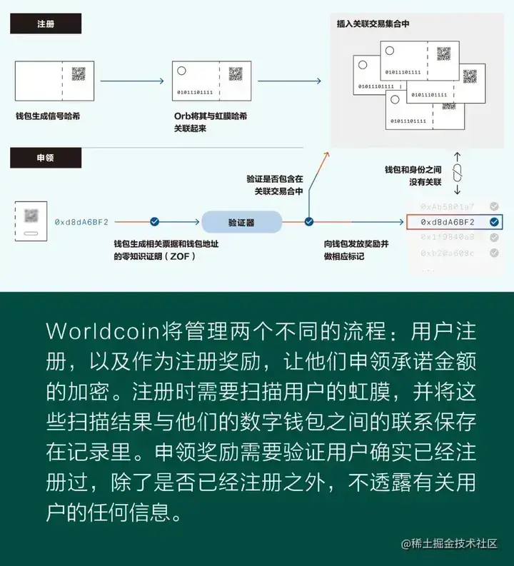 免费申领Worldcoin的流程依赖的是一种叫做“零知识证明”(ZKP)的加密技术,它可以让用户在不泄露秘密的情况下证明自己知道该秘密。该App钱包使用开源协议来生成ZKP,表示持有者的私钥与区块链上的某个公钥哈希相关联,但不透露是哪一个。这样,Worldcoin就不会知道哪个公钥与哪个钱包地址相关联。一旦公司的服务器验证通过这种关联,就会向钱包发送代币。ZKP还包括一串对每个用户来说都独特的数字,称为“无效符”(nullifier),表明他们之前是否曾试图申领过货币,而不泄露用户的身份。