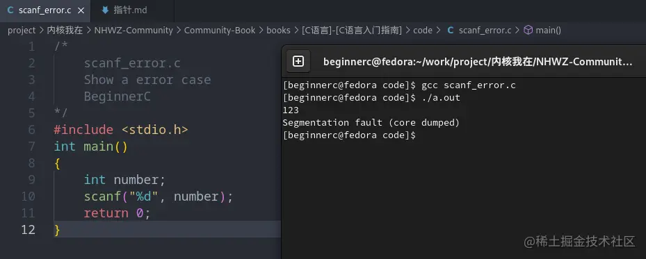 在这个案例中,我们在为 scanf 函数提供参数的时候,没有使用 & 运算提取 number 的地址,而是直接传入。