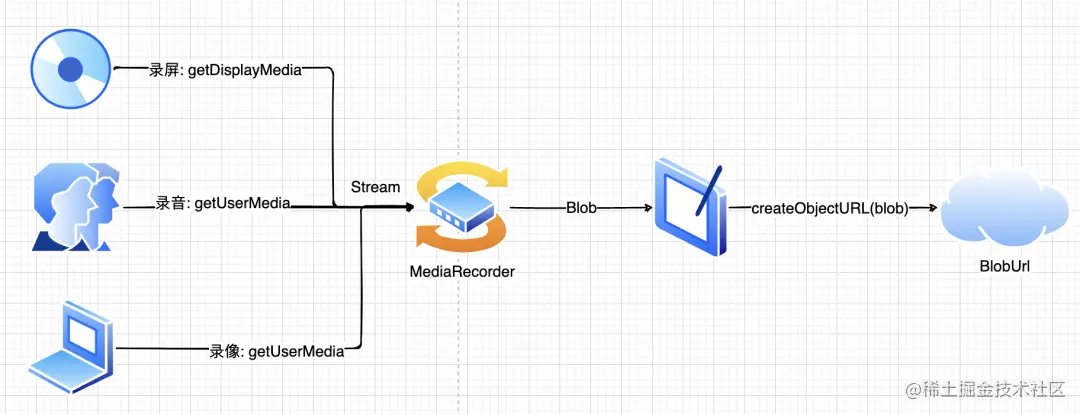 getUserMedia可用于获取麦克风以及摄像头的流getDisplayMedia则用于获取屏幕的视频、音频流- 录东西的本质是 stream -> blobList -> blob url,其中 MediaRecorder 可监听 stream 从而获取 blob 数据