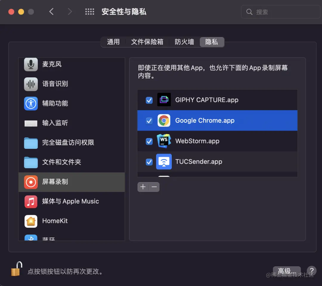 注意:无论是录像、录音、录屏都是要调用系统的能力,而网页只是问浏览器要这个能力,但这样的前提是浏览器已经拥有了系统权限了,所以必须在系统设置里允许浏览器有这些权限才能录屏。