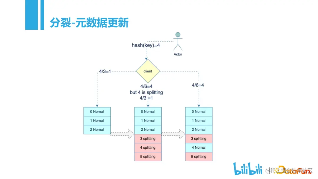 假设一张表最开始设计了3个分片,当数据4到来,根据hash取余,应该保存在分片1中。随着数据的增长,3个分片放不下,则需要进行分裂,3个分片会分裂成6个分片。这个时候数据4来访问,根据Hash会分配到分片4,如果分片4正处于分裂状态,Metaserver会对访问进行重定向,还是访问到原来的分片1。当分片完成,状态变为normal,就可以正常接收访问,这一过程,用户是无感知的。