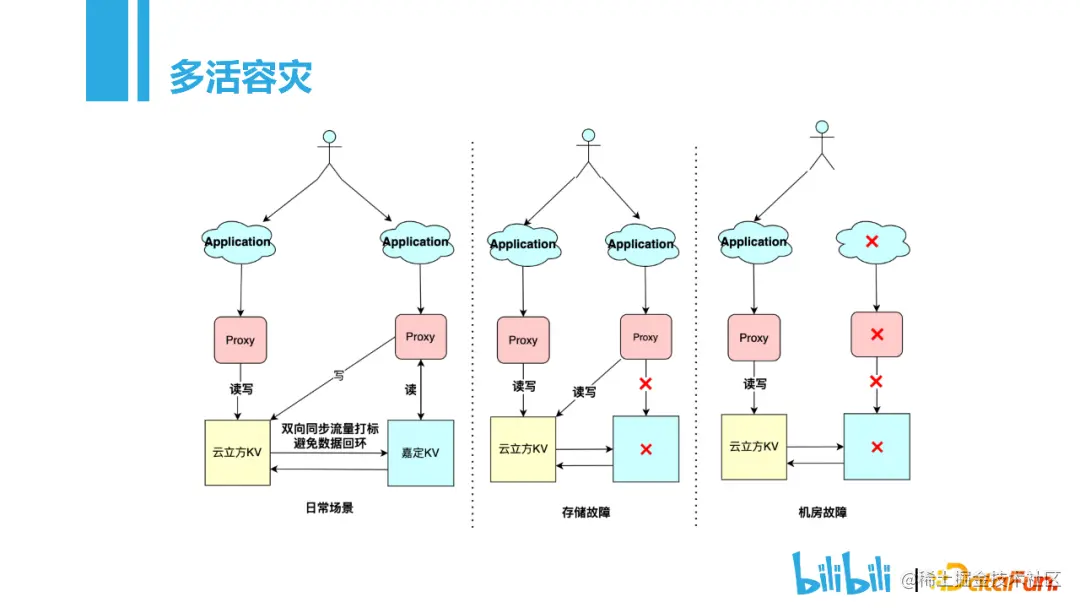 前面提到的分裂和Metaserver来保证高可用,对某些场景仍不能满足需求。比如整个机房的集群挂掉,这在业界多是采用多活来解决。我们KV存储的多活也是基于Binlog来实现,比如在云立方的机房写入一条数据,会通过Binlog同步到嘉定的机房。假如位于嘉定的机房的存储部分挂了以后,proxy模块会自动将流量切到云立方的机房进行读写操作。最极端的情况,整个机房挂掉了,就会将所有的用户访问集中到里一个机房,保证可用性。