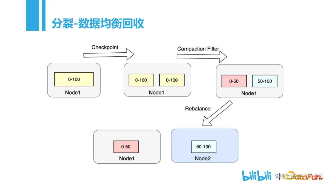 首先需要先将数据分裂,可以理解为本地做一个checkpoint,Rocksdb的checkpoint相当于是做了一个硬链接,通常1ms就可以完成数据的分裂。分裂完成后,Metaserver会同步更新元数据信息,比如0-100的数据,分裂之后,分片1的50-100的数据其实是不需要的,就可以通过Compaction Filter对数据进行回收。最后将分裂后的数据分配到不同的节点上。因为整个过程都是对一批数据进行操作,而不是像redis那样主从复制的时候一条一条复制,得益于这样的实现,整个分裂过程都在毫秒级别。