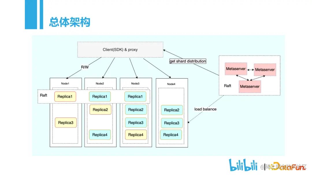 总体架构共分为三个部分Client,Node,Metaserver。 Client是用户接入端,确定了用户的接入方式,用户可以采用SDK的方式进行接入。Metaserver主要是存储表的元数据信息,表分为了哪些分片,这些分片位于哪些node之上。用户在读写操作的时候,只需要put、get方法,无需关注分布式实现的技术细节。Node的核心点就是Replica,每一张表会有多个分片,而每个分片会有多个Replica副本,通过Raft实现副本之间的同步复制,保证高可用。
