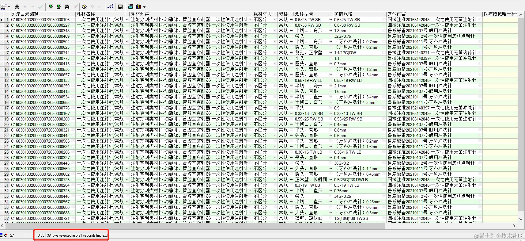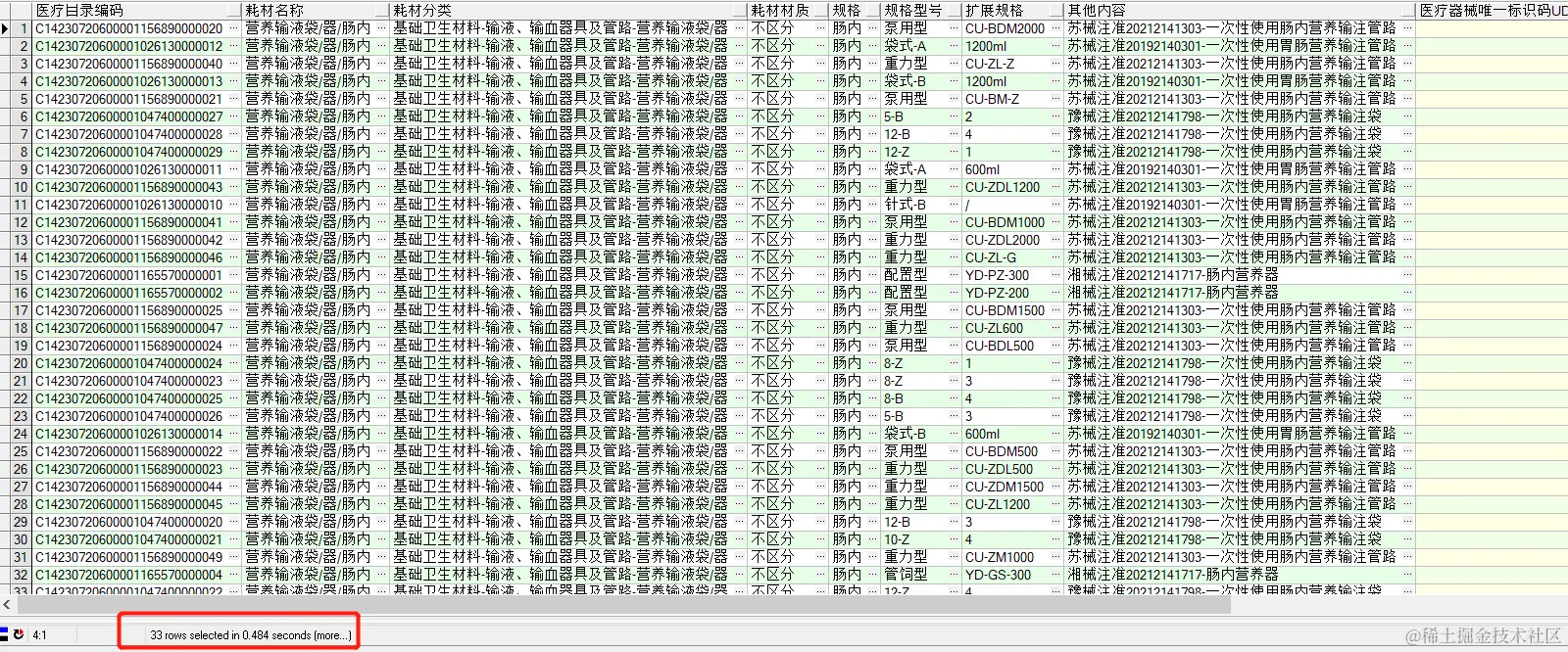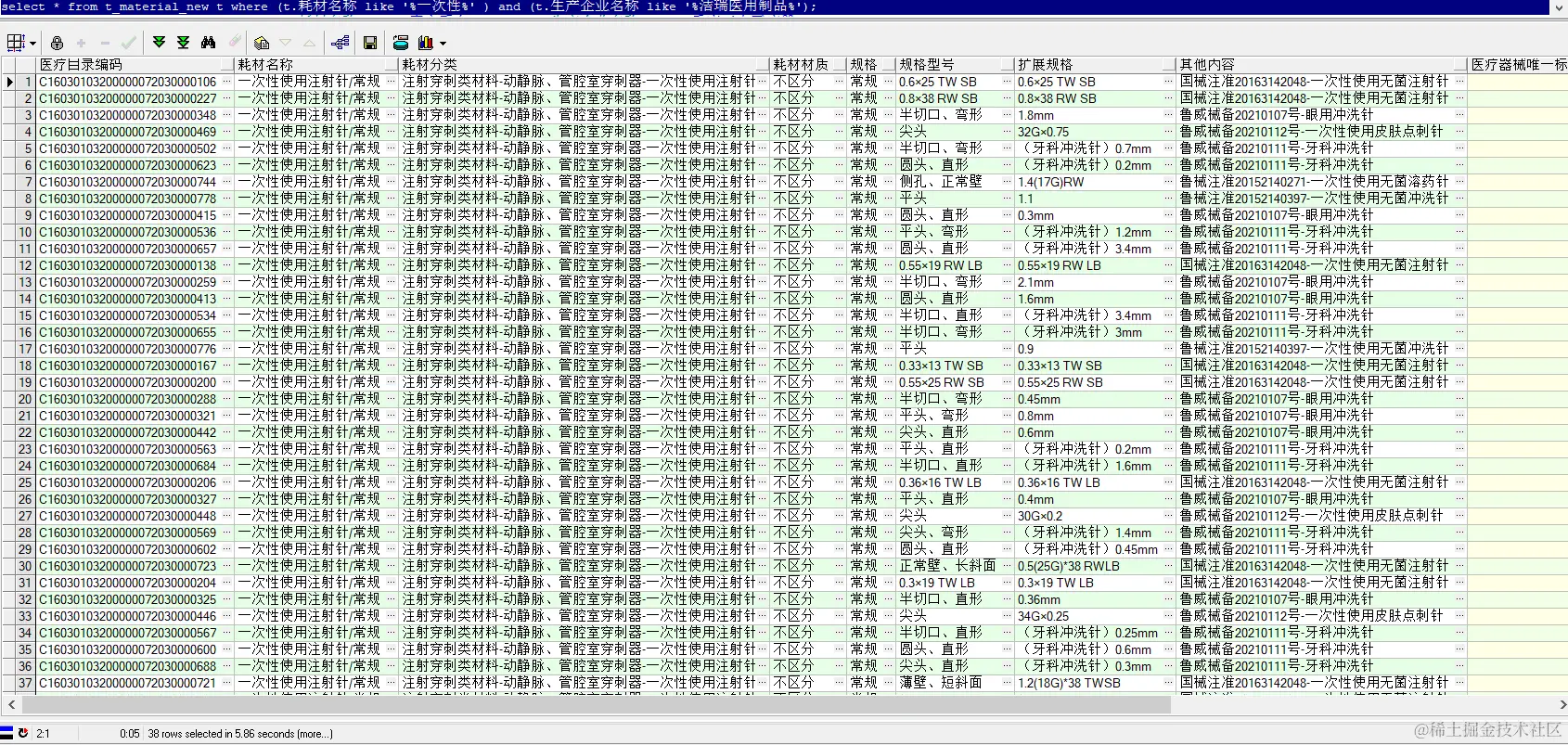 select * from t_material_new t where instr(t.耗材名称,'一次性')>0 and instr(t.生产企业名称, '洁瑞医用制品')>0; -- 得到结果集只需要3.812秒