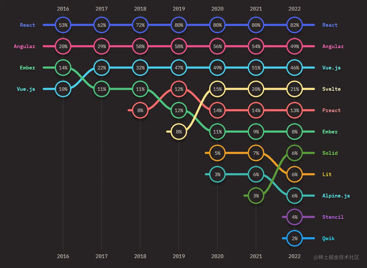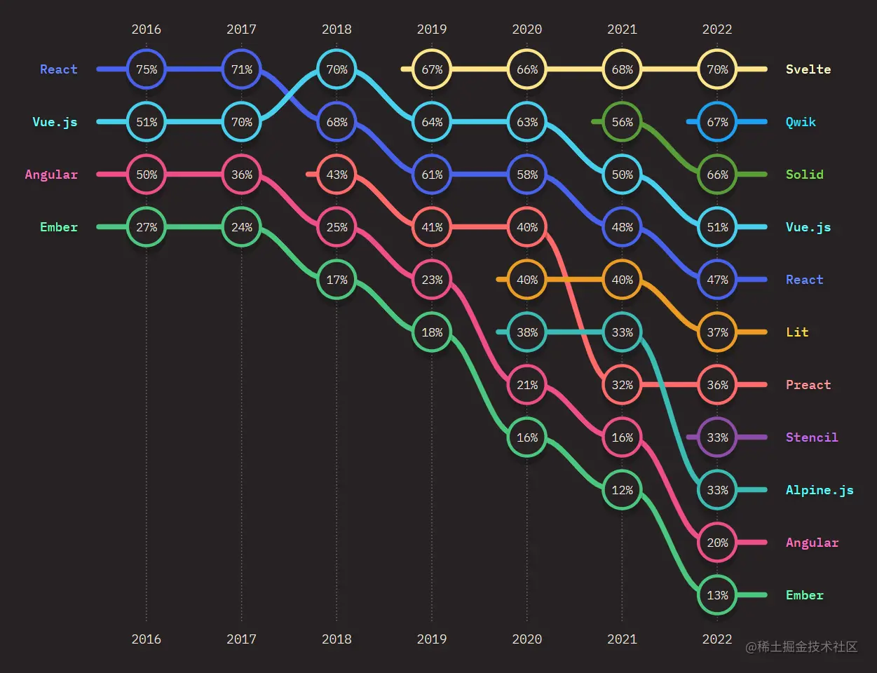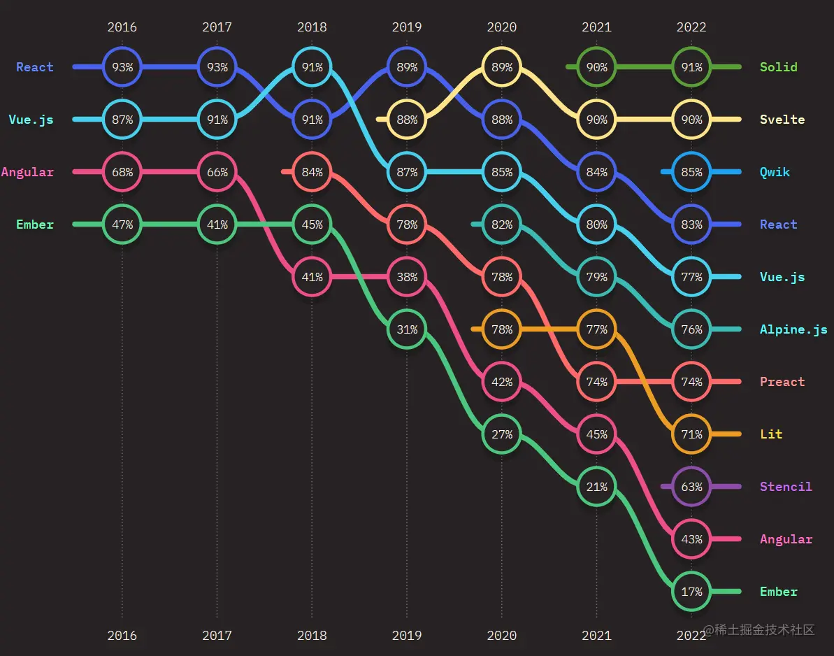 从2019年开始, Svelte出现在榜单中。2020年,Svelte在满意度排行榜中超越了react,跃升到了第一位。在过去的两年里,也是碾压三大框架的存在,还能与最新的 Solid 并驾齐驱(都是90%)。