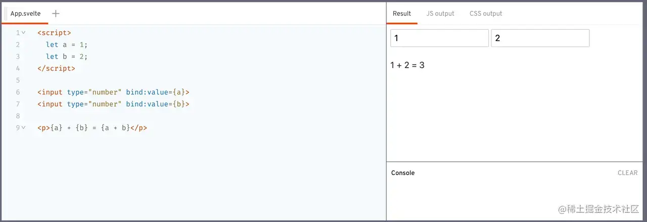 实现的功能也很简单,就是两个Input的值求和,然后展示出来。图中是用svelte编写的代码。 看下 React 书写的版本: