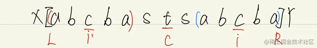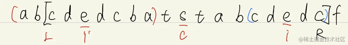 - 在每个字符之间以及字符串的开头和结尾插入特殊字符(例如'#')以处理奇数长度和偶数长度的回文。(注:下文为了理解省略‘#’,