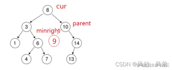 当找到minright时,minright在9节点位置上,minright可以替代cur的位置,替cur照顾两个孩子,但是minright本身也是有可能有孩子的,所以还需要找到minright的上一个父节点parent,同时需要判断下minright节点是parent节点的左孩子还是有孩子