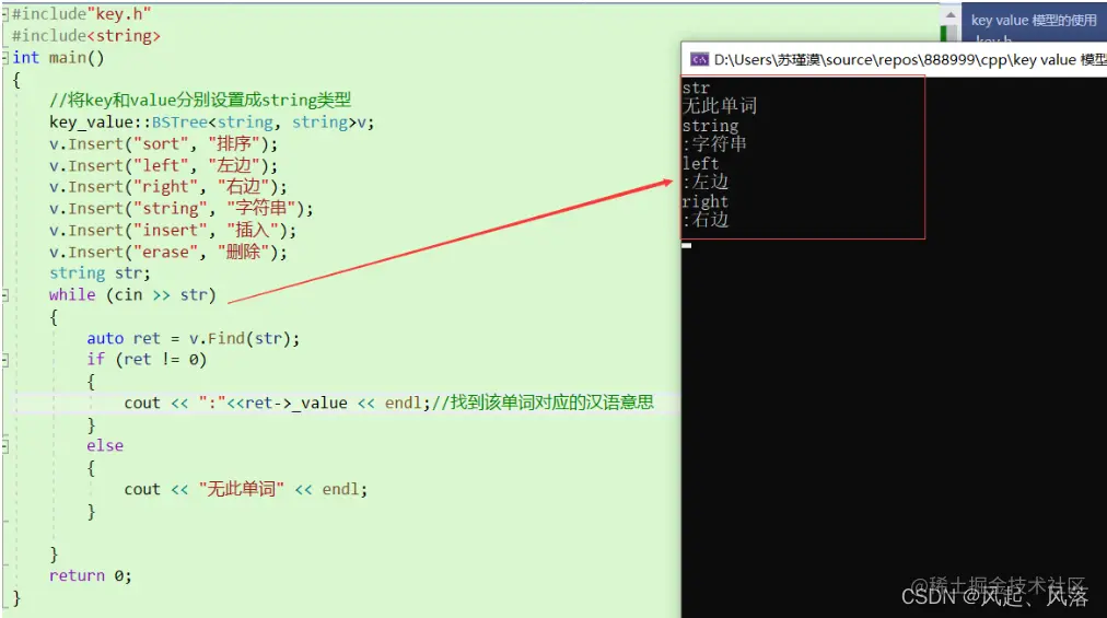 通过插入将预先设置好的单词与对应意思输入树中, 输入str时,在树中查找该单词是否存在 若找到则返回节点指针指向的value,若没找到则返回nuullptr