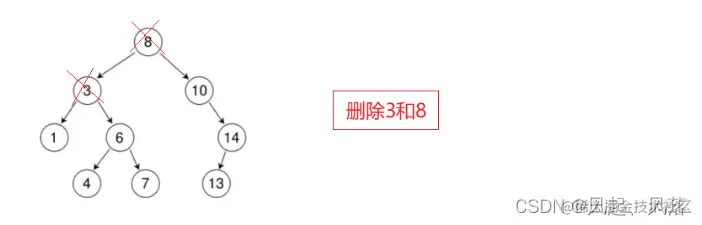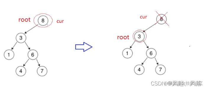 删除8节点,就需要寻找左子树的最大节点或者右子树最小节点 来当树的根节点 左子树的最大节点是最右节点 右子树的最小节点是最左节点 假设删除节点8,通过右子树的最小节点来进行替换,将右子树的最小节点替换掉cur节点值,删除右子树的最小节点即可