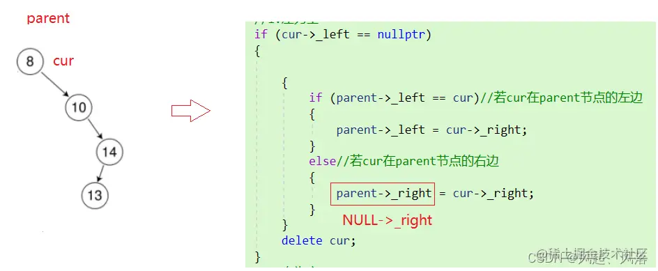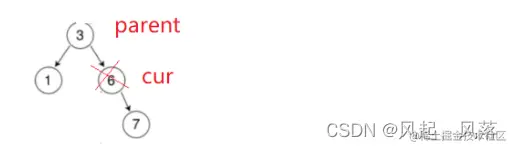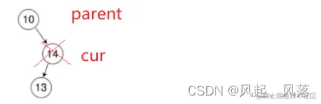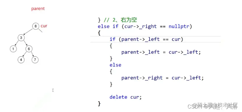右为空时,使用parent节点去接收cur的左子树,但是还需判断下cur的左子树节点在parent的左子树还是右子树