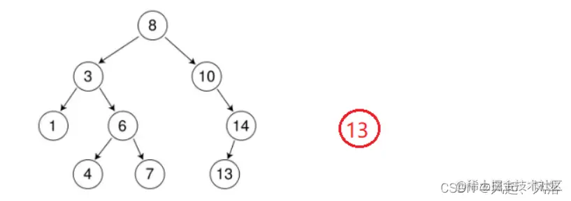 若插入11,因为11比8大,所以跟10比较,而11比10大,所以走10的右子树14,14与11比较,因14>11,所以走14的左子树13,11与13比较,因13>11,故作为13的左子树,遇见NULL指针停止
