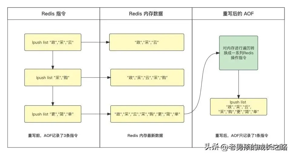 重写机制有“多变一”的功能,将旧日志中的多条指令,在重写后就变成了一条指令。如下所示:三条 lpush 命令,经过 AOF 重写后生成一条,对于多次修改的场景,缩减效果明显。