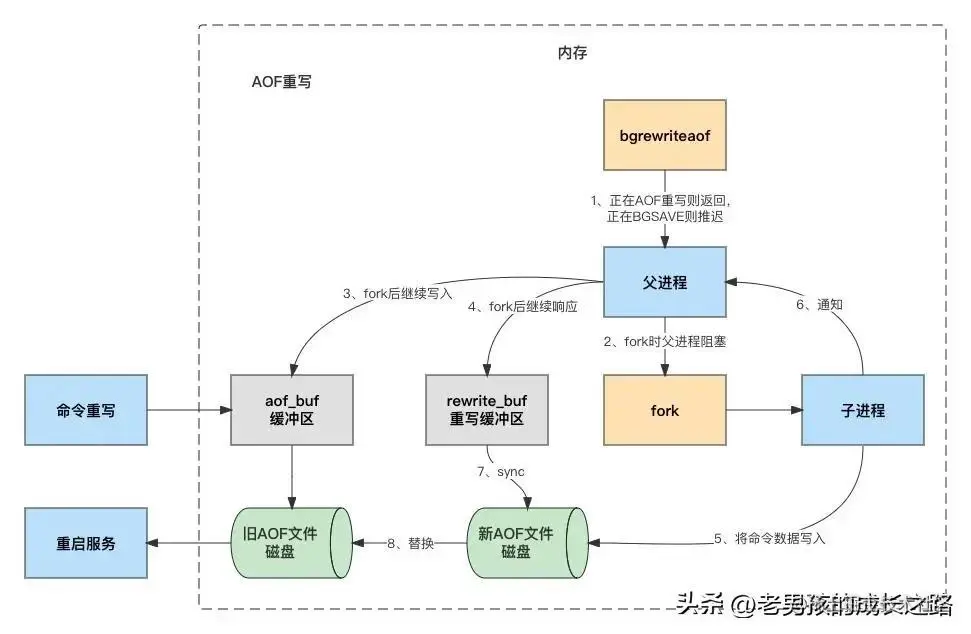 总的来说,一共出现两个日志,一次内存数据拷贝,分别是旧的 AOF 日志和新的 AOF 重写日志和Redis 数据拷贝。大致流程如下图所示: